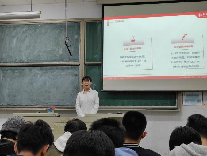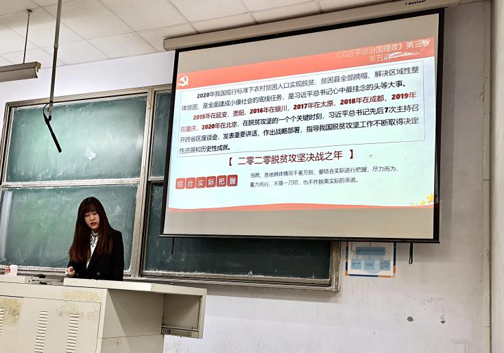 徐圣权以《四个视角把握“百年未有之大变局”》为题,阐述了生产力发展水平产生了新的变化,蓬勃之势百年未有;国际力量对比的新变化,力量结构向多级转化,力量重心转移;互联网时代、社交媒体时代全球的治理都面临新的挑战和机遇;变局本身发生了变化,复杂程度是百年未有。宋佳以《维护香港、澳门长期繁荣稳定,推进祖国和平统一——加强爱国主义教育》为题,从港澳台问题出发,进一步深化爱国主义内涵,阐述了当代大学生爱国主义教育的必要性及重要性。宋婷婷以《决胜全面建成小康社会 决战脱贫攻坚》为题,从《全面完成决胜全面建成小康社会各项任务》《谱写人类反贫困历史新篇章》《全面打好脱贫攻坚战》《着力解决“两不愁三保障”突出问题》四篇文章出发,阐述了只要全党全国各族人民齐心协力、顽强奋斗,脱贫攻坚战一定能够打好打赢的深刻内涵。郑亚坤则以《在战疫大考中书写人类命运共同体的中国答卷》为视角,从中国有效地抵挡了病毒在全球攻击的“第一波”,积极有序推进复工复产等例子出发,展现了人类命运共同体的理念。