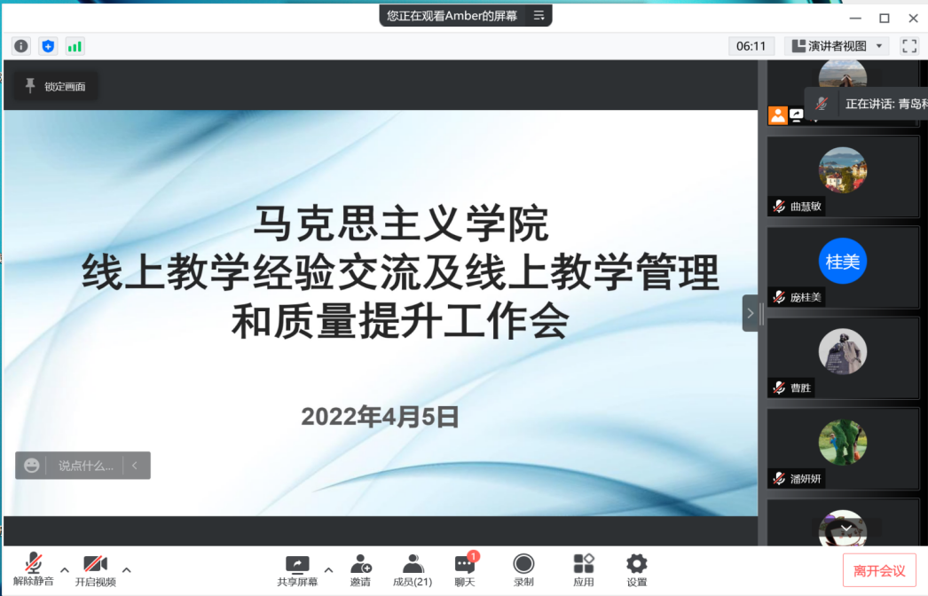 各教研室老师结合教学实际,对线上教学经验进行了分享与交流。校级督导员张志耀、庞桂美、潘妍妍及教师代表戴雪丽、孟雪静、邵涵、邵长威、田雨、王建美集中围绕着如何在线上教学环境下提升教学实效性、提升线上课堂质量、增强学生参与度、增强师生互动性、加强课堂管理等方面进行了讨论。与会教师一致表示,要从教师教学能力提升、课程教学信息化和教学质量监控三个方面继续努力,进一步提升和保证思政课线上教学的质量。