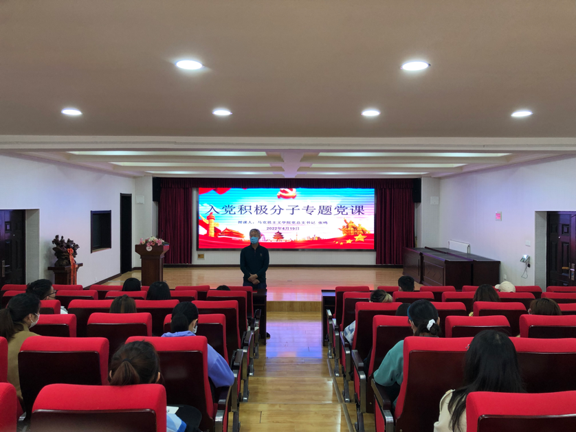 2022年4月19日下午,学院党总支书记张鸣面向全院学生入党积极分子和党员发展对象,以“坚定理想信念,端正入党动机,做新时代青年共产主义者”为题讲授党课,旨在进一步加强对入党积极分子的思想教育,帮助他们端正入党动机,树立为共产主义事业奋斗终身的信念。