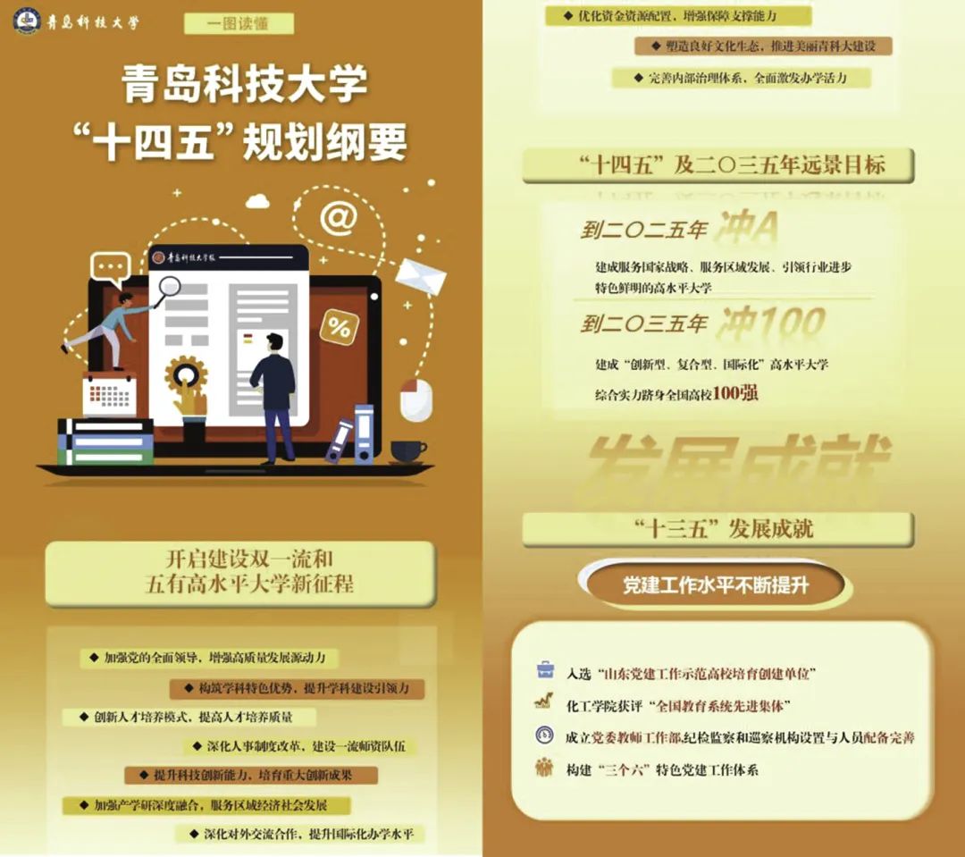 立足“十四五”开新局,学校制定了《“十四 五”发展规划和二〇三五年远景目标纲要》,明确了建成“服务国家战略、服务区域发展,引领行业进步特色鲜明的高水平大学”的发展目标,并从发展基础与发展环境,指导思想、遵循原则与主要目标,主要任务与思路举措,组织实施四个方面进行了阐释。明确了加强党的全面领导、增强高质量发展源动力,构筑学科特色优势、提升学科建设引领力,创新太阳集团模式、提高太阳集团质量,深化人事制度改革、建设一流师资队伍,提升科技创新能力、培育重大创新成果,加强产学研深度融合、服务区域发展,深化对外交流合作、提升国际化办学水平,优化资金资源配置、增强保障支撑能力,塑造良好文化生态、推进美丽青科大建设,完善内部治理体系、全面激发办学活力等十个方面的任务和措施。为学校未来五年乃至更长时期的战略规划、事业发展的总体目标、主要任务和重大举措提供基本遵循,进行顶层设计,成为全校师生员工共同奋斗的目标引领。