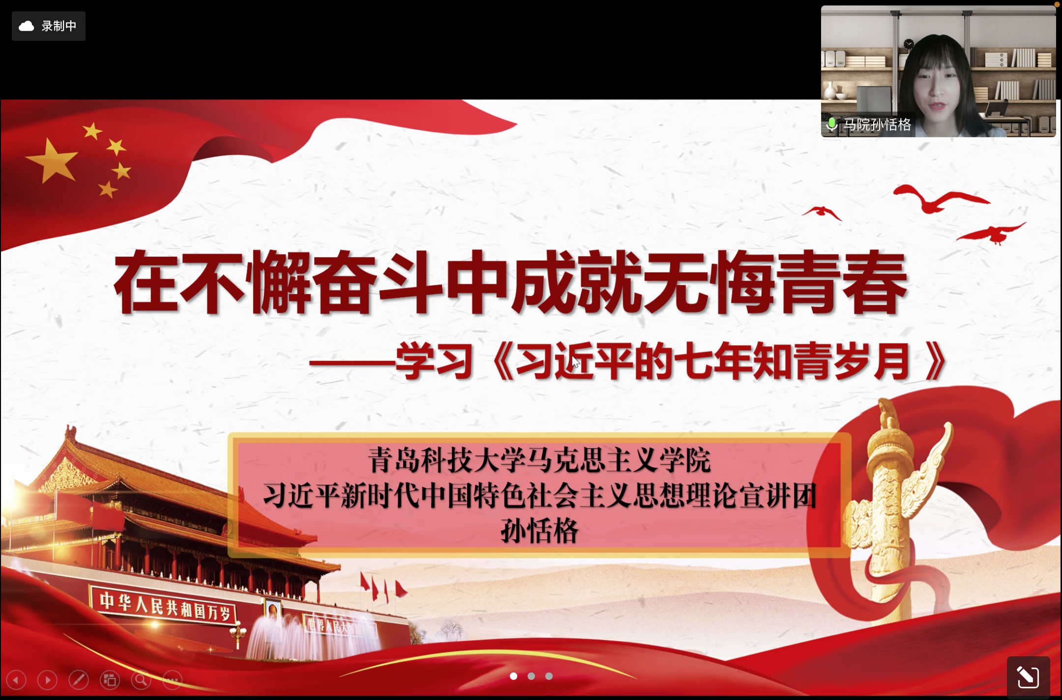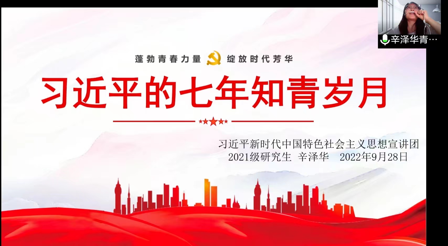 孙恬格以《习近平的七年知青岁月》一书为切入点,为大家全方位解读了求知若饥、问学若渴,务实担当、知行合一,艰苦奋斗、吃苦耐劳,信念坚定、矢志不渝的青年习近平。她鼓励大家围绕新时代谋划未来,在新时代谱写更美好的青春之歌,用青春奋斗汇聚起推动时代前行的磅礴力量。