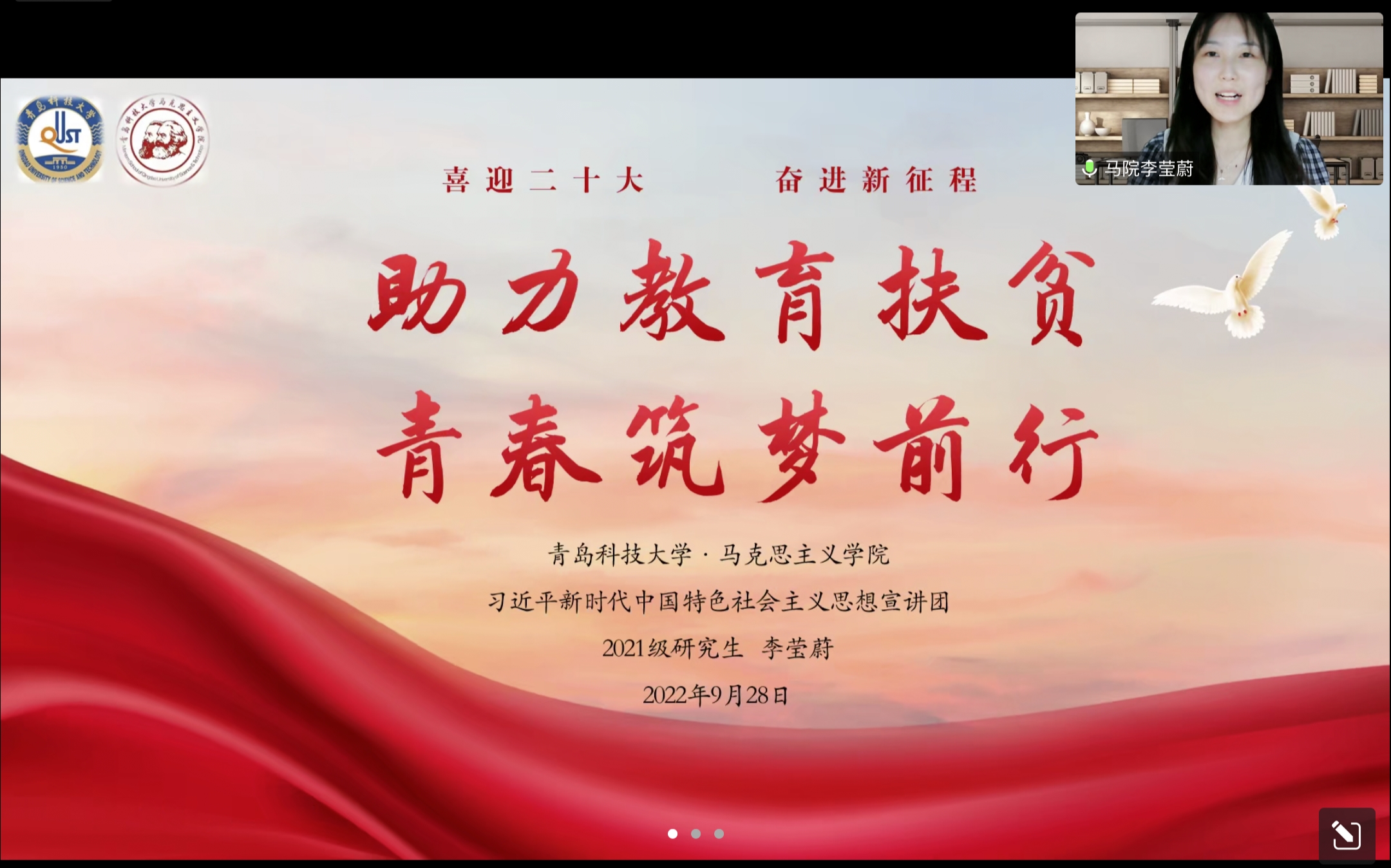 李莹蔚以《助力教育扶贫,青春筑梦前行》为题,为大家详细梳理了教育扶贫从形成到成熟的发展过程,强调了教育对于阻断贫困现象代际传递的重要意义。她向研究生支教团成员们倡议:在支教岗位上践行橡胶品格,发扬科大家风,贯彻学校第十一次党代会精神,立足岗位,发光发热,以实际行动迎接党的二十大胜利召开。