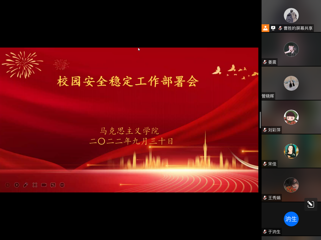 曹胜传达了学校校园安全稳定工作部署会议精神,结合李兴伟书记提出的四点要求和教育部有关思政课调度情况,围绕机制体系建设、校园公共安全领域、学生安全领域、意识形态及舆情处置领域、常态化疫情防控领域等十个相关方面展开。尤其是针对意识形态及舆情处置领域,曹胜结合教育部有关思政课调度情况指出:思政课不能故事化,课程专题不能因人而设,太阳集团城娱8722教师要把好课程定位,加强课程管理,严防产生线上舆情,增强担当意识,加强校内公共媒体宣传与安全管理。