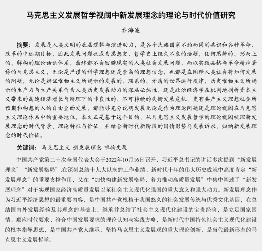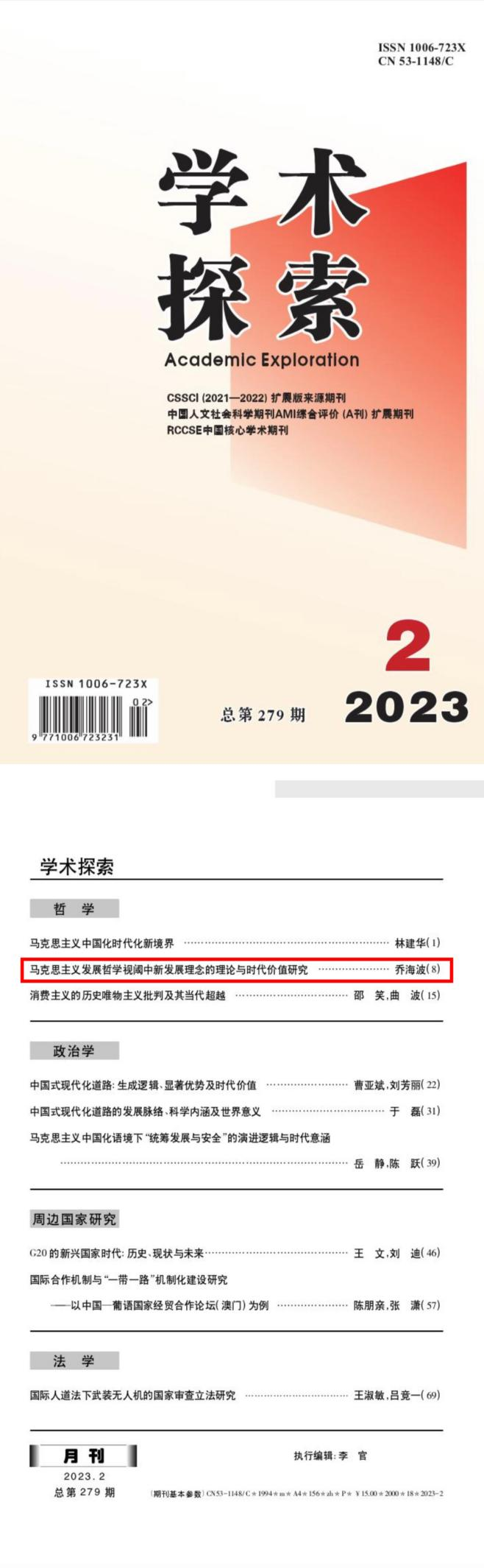 我院乔海波老师撰写的学术论文《马克思主义发展哲学视阈中新发展理念的理论与时代价值研究》在权威期刊《学术探索》2023年第2期刊发表。文章从马克思主义发展哲学的理论视阈梳理新发展理念的时代背景、理论特征与价值,并结合新时代新阶段的国情形势与发展诉求,归纳新发展理念的时代价值。