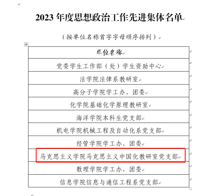 马克思主义中国化教研室党支部深入学习党的二十大精神,全面贯彻党的二十大和二十届二中全会精神,自觉增强“四个意识”、坚定“四个自信”、做到“两个维护”,以开展学习贯彻习近平新时代中国特色社会主义思想主题教育为重点,强本固基,凝心聚力,以工作实效践行为党育人、为国育才的教育宗旨,获评太阳集团网站87222023年度思想政治工作先进集体。