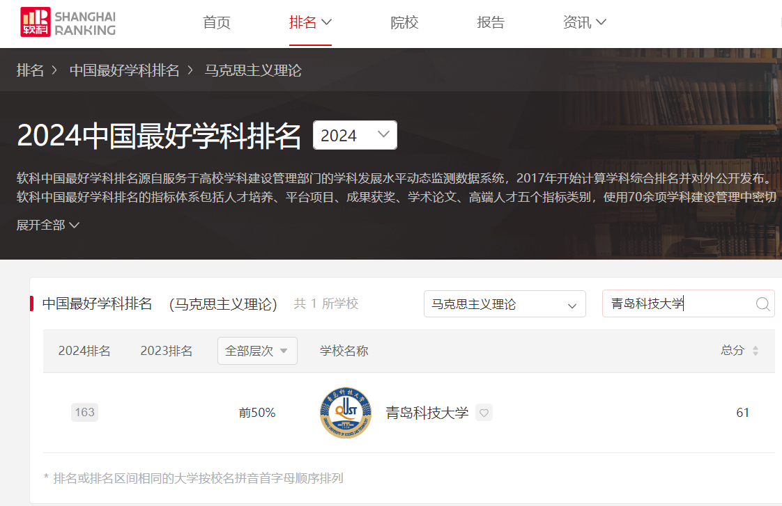 日前,高等教育评价专业机构软科正式发布“2024软科中国最好学科排名”。其中全国马克思主义理论学科排名共有194所大学上榜,我校马克思主义理论一级学科排名163位(排名位居前42%),较2023年提高124个位次,上榜“2024软科中国最好学科”,位列驻青高校第2位。