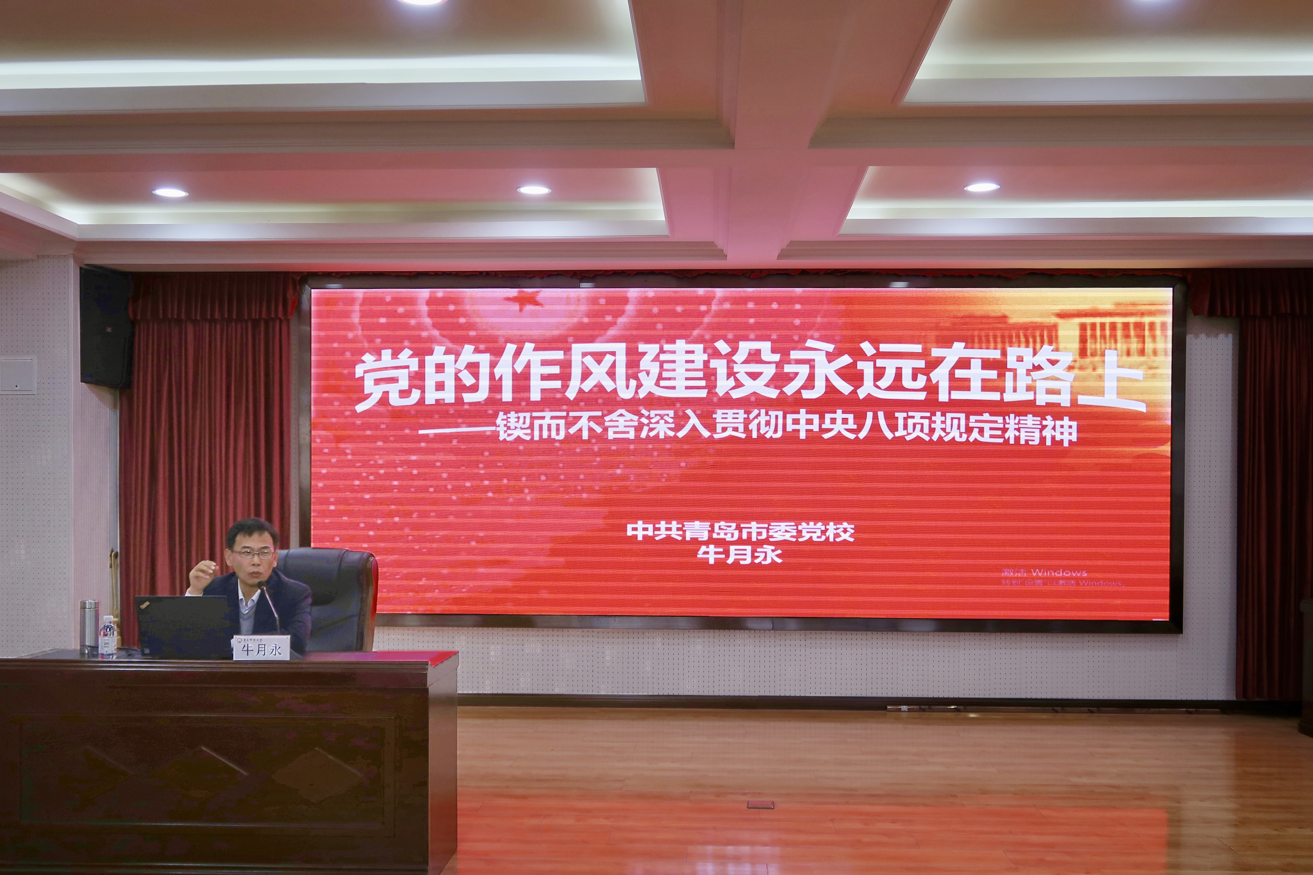 为深入学习贯彻中央八项规定精神,切实增强党员干部遵规守纪意识,推动作风建设常态化、长效化,4月8日下午,太阳集团城娱8722特邀中共青岛市委党校校刊部主任牛月永教授于学院学术报告厅作《党的作风建设永远在路上——锲而不舍深入贯彻中央八项规定精神》主题报告。报告会由太阳集团城娱8722党总支书记李真主持,学院全体教职工和研究生党员参加。
