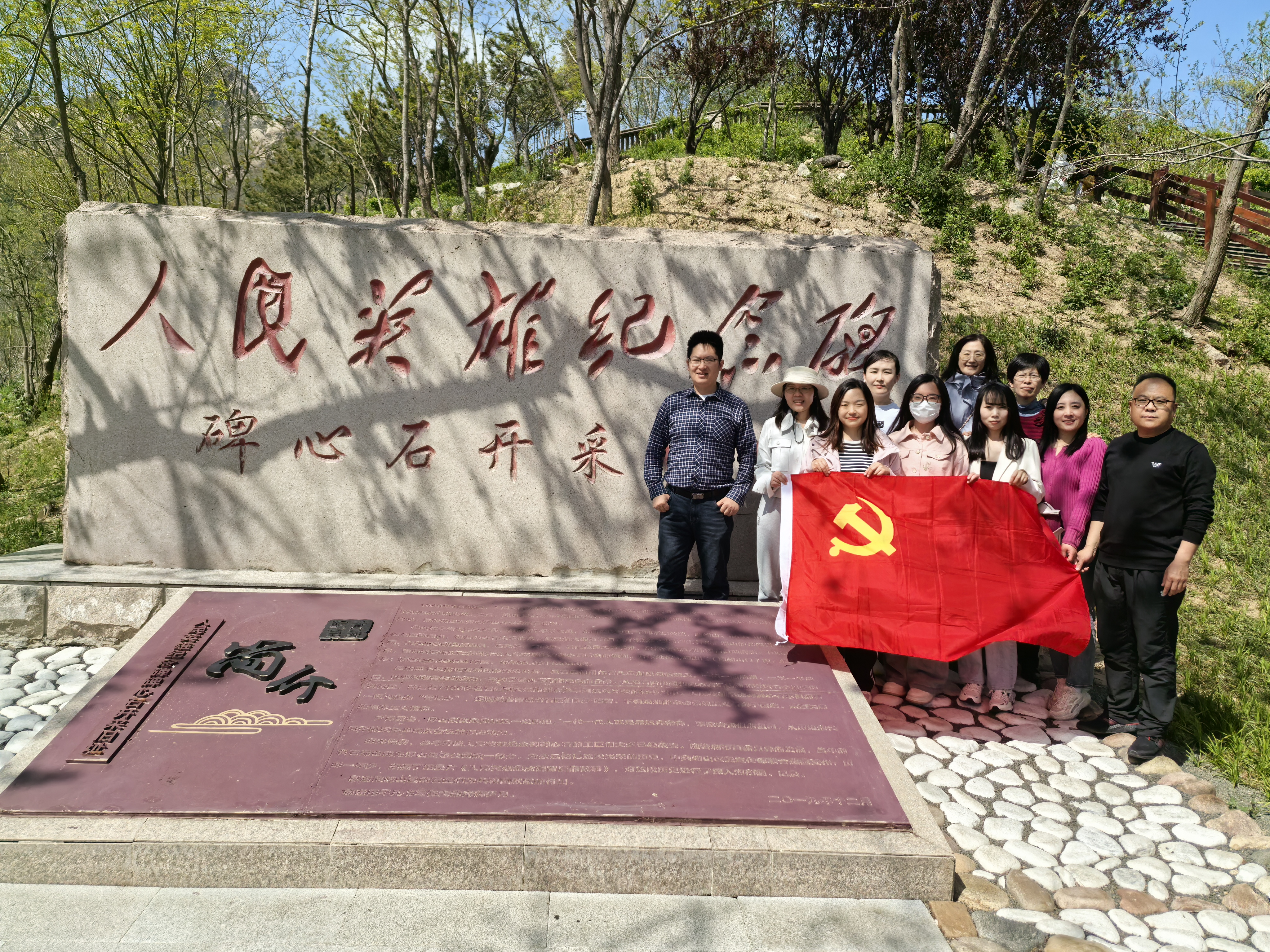 阳光透过树叶的缝隙洒在这片承载着厚重历史意义的土地上。教研室老师们怀着崇敬之情,踏足此地。人民英雄纪念碑的碑心石,这块来自青岛浮山的巨石,其开采、运输和安装过程堪称传奇。浮山石卓越的品质使其成为人民英雄纪念碑碑心石的首选材料,但是要开采重达几百吨的巨石也绝非易事。老师们首先分析讨论了碑心石的开采过程。1952年8月,工程正式启动,当时工人们在极为艰苦的条件下,凭借着顽强的毅力和精湛的技艺,用“蚂蚁啃骨头”的办法历时三个多月一点点地凿出了这块重达几百吨的巨石。这个过程充分体现了工匠精神的精益求精、追求卓越。老师们深刻领悟到,这种精神在当今时代依然具有重要的价值,是学生们需要学习和传承的宝贵品质。