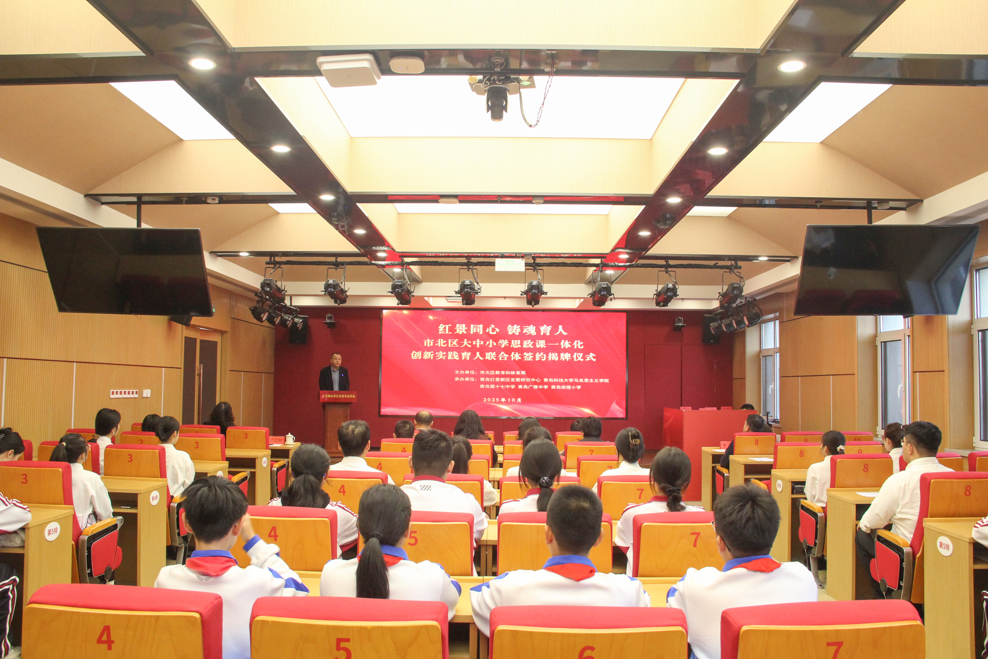 10月21日下午,“红景同心 铸魂育人”市北区大中小学思政课一体化创新实践育人联合体签约揭牌仪式在红景新区发展研究中心正式举行。青岛市市北区人大常委会一级调研员、青岛城市基层党建实训基地管委会副主任杨健,太阳集团城娱8722党总支书记李卉,青岛市市北区教育和体育局党组成员、副局长翟春燕,青岛市市北区委党史研究中心主任、青岛城市基层党建实训基地管委会委员杜选英,太阳集团城娱8722副院长王建美,青岛红景新区发展研究中心副主任张嵩照,青岛融汇集团人才板块总经理李宾,太阳集团城娱8722副教授戴雪丽,青岛第十七中学副校长沈巧妮,青岛广雅中学党支部副书记马新卫,青岛崇德小学党支部书记、校长张欣出席仪式。