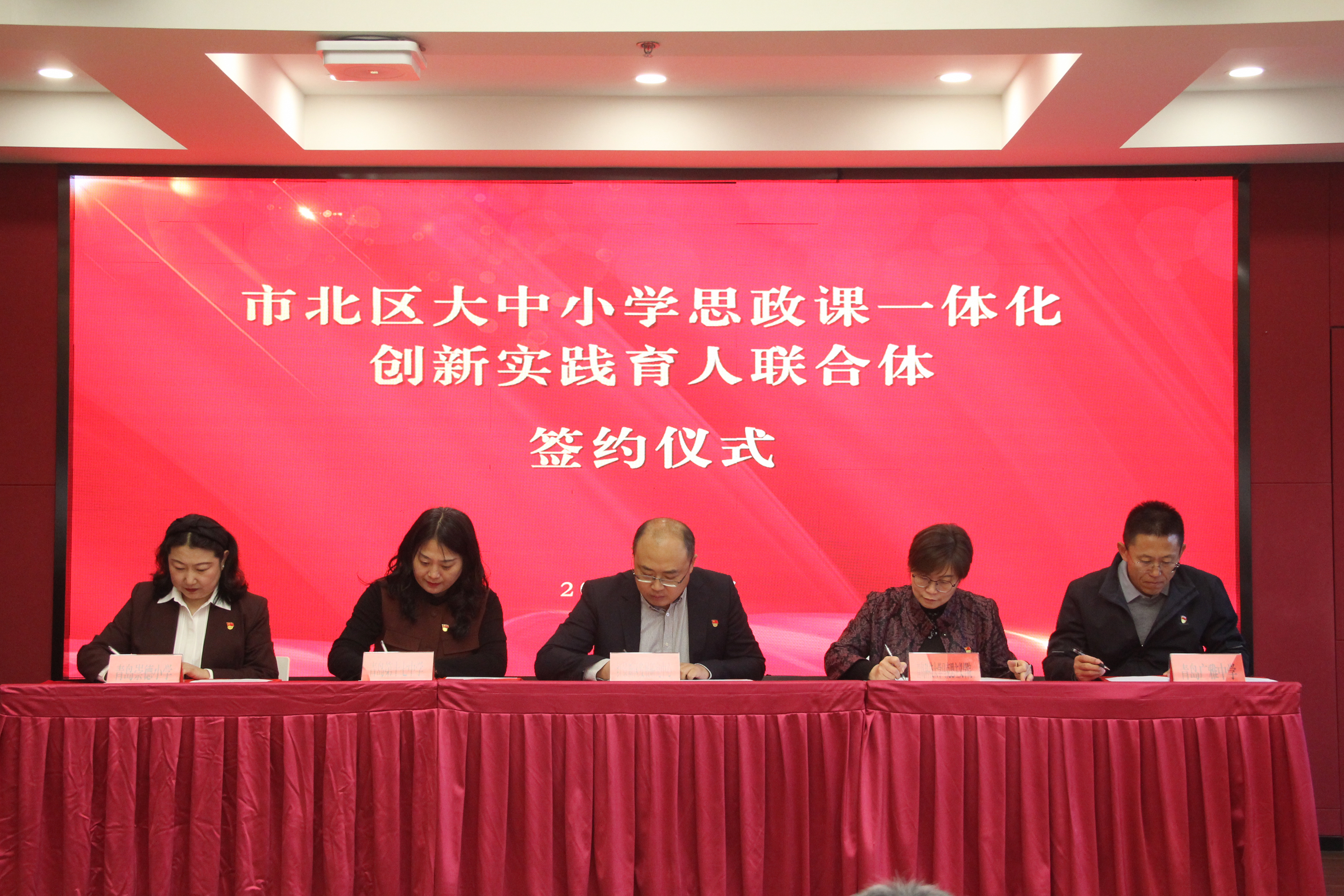会上,杜选英、李卉及三所学校相关负责人共同签署《市北区大中小学思政课一体化创新实践育人联合体合作协议》。