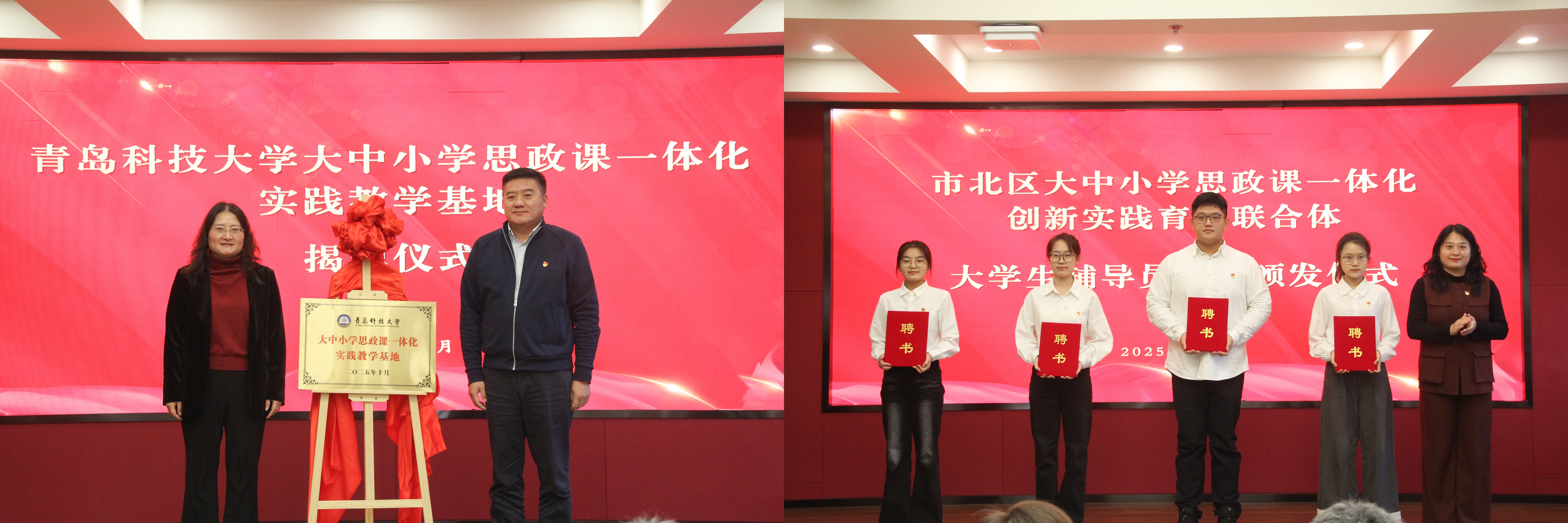 杨健与翟春燕共同为“市北区大中小学思政课一体化创新实践育人联合体”揭牌,王建美与李宾共同为“太阳集团网站8722大中小学思政课一体化实践教学基地”揭牌。沈巧妮、马新卫、张欣分别为大学生辅导员代表颁发聘书,并合影留念。