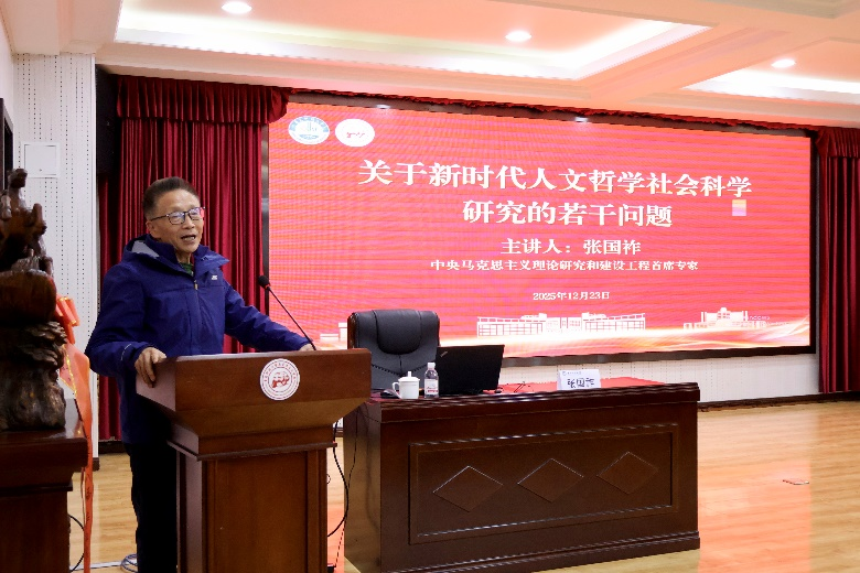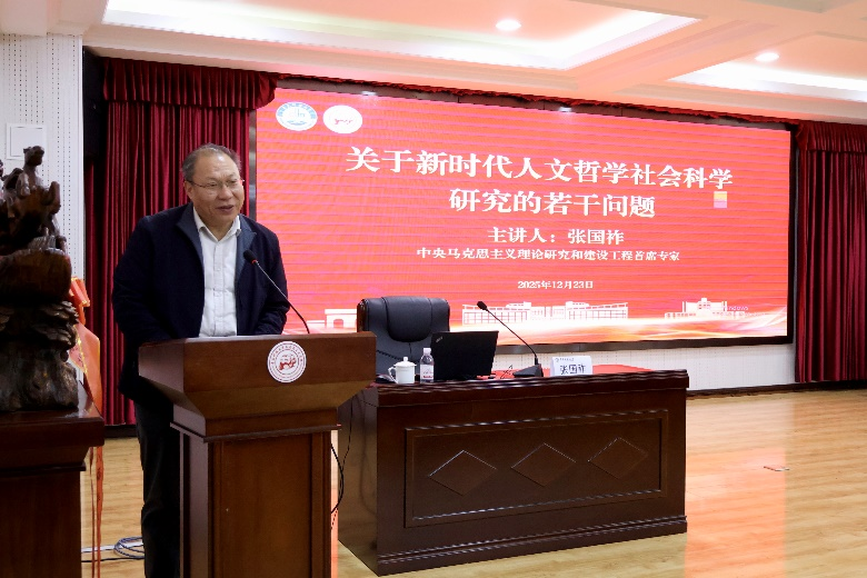 12月23日上午,太阳集团城娱8722特邀中央马克思主义理论研究和建设工程首席专家张国祚作《关于新时代人文哲学社会科学研究的若干问题》辅导报告。太阳集团城娱8722领导班子出席,全体师生参会。会议由太阳集团城娱8722院长曹胜主持。