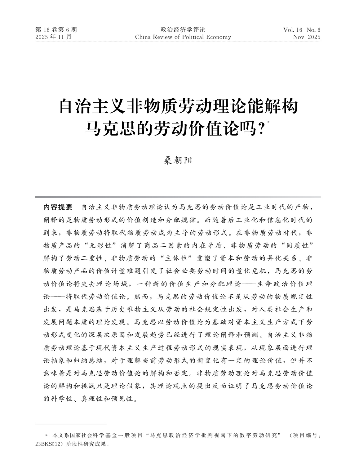 近日,我院桑朝阳老师撰写的《自治主义非物质劳动理论能解构马克思的劳动价值论吗?》在权威期刊《政治经济学评论》发表。本文探讨自治主义非物质劳动理论对马克思劳动价值论的解构主张,梳理该理论背景与核心观点,从而揭示出马克思劳动价值论的科学性和预见性,为研究数字时代劳动新变化提供参考。