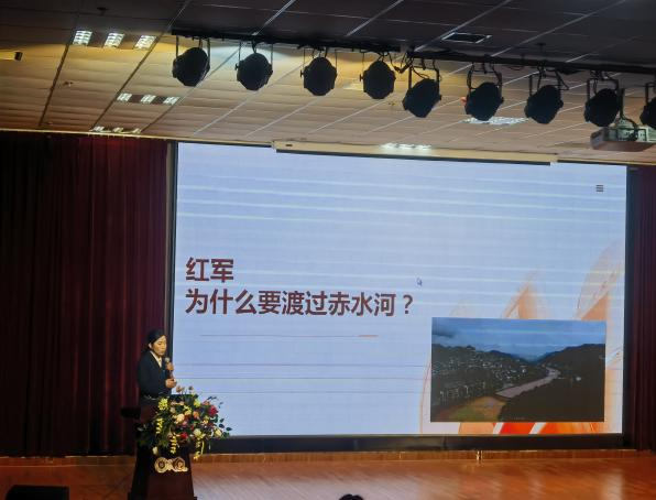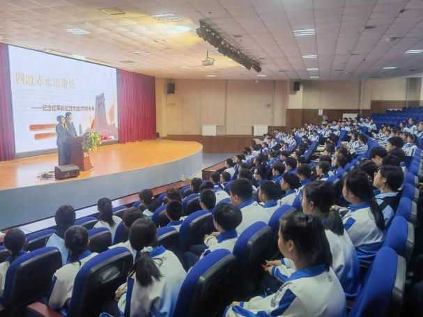 栗贤、郭雅菲结合初中青少年认知特点与兴趣习惯,用通俗鲜活的青春话语、真实具象的长征史实案例,全景式、沉浸式还原四渡赤水经典战役全貌,细致讲述红军指战员以弱胜强、临危应变、攻坚克难的英雄事迹,解读战役背后的红色智慧与革命初心。宣讲开篇以“红军为什么要渡过赤水河”为核心设问,引导学生独立思考、主动探究,充分调动全员参与积极性。互动环节中,学院师生积极回应学子疑问,结合自身经历将长征精神与中学生课业学习、身心成长相结合,正向引导青少年传承红色基因、锤炼坚韧品格。