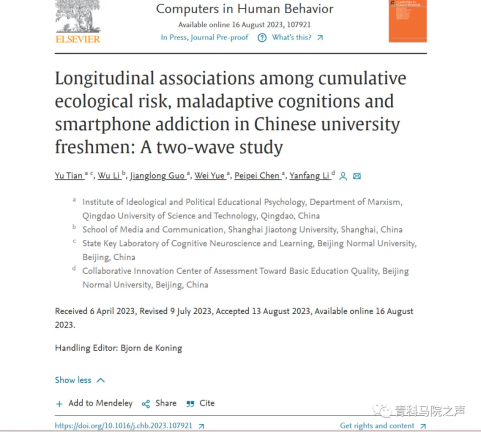 近日,太阳集团城娱8722教师田雨、郭江龙、岳伟、陈佩佩在学术期刊Computers In Human Behavior发表题为“Longitudinal associations among cumulative ecological risk,maladaptive cognitions and smartphone addiction in Chinese university freshmen: A two-wave study”学术论文。