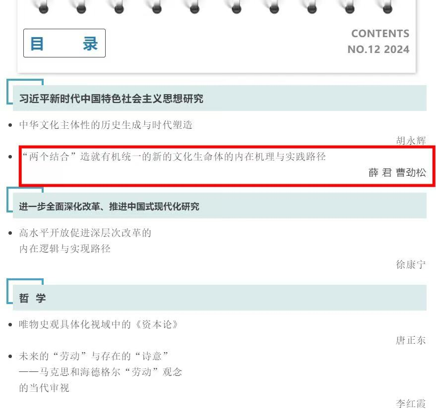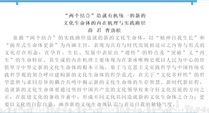 我院薛君老师撰写的学术论文《“两个结合”造就有机统一的新的文化生命体的内在机理与实践路径》在核心期刊《南京社会科学》2024年第12期刊发表,《南京社会科学》创刊于1990年,是由中共南京市委宣传部主管,南京市社会科学界联合会、南京市社会科学院主办的综合性社科学术月刊,位列CSSCI来源期刊的前20%。文章强调新时代新征程,造就新的文化生命体要通过坚持中国共产党的文化领导权来守好文化发展的方向之正;在促进文化的兼收并蓄中,形成不同文化共同造就新的文化生命体之合力;更要以文化的自信自强,涵养新的文化生命体认识与表达自我的独特气度。近年来,学院紧紧围绕学科建设的重点方向和突出问题开展学术研究,高水平期刊论文的数量、质量得到显著提升。