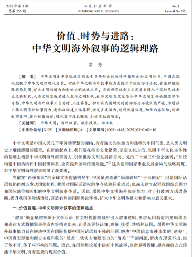 近日,我院宗芳老师撰写的学术论文《价值、时势与进路:中华文明海外叙事的逻辑理路》在CSSCI来源期刊《山东社会科学》2025年第3期发表。《山东社会科学》是由山东省社会科学界联合会主管主办、《山东社会科学》杂志社编辑出版的综合性哲学社会科学类学术期刊,创刊于1987年。该期刊被认定为CSSCI来源期刊、全国中文核心期刊、中国人文社会科学核心期刊等。