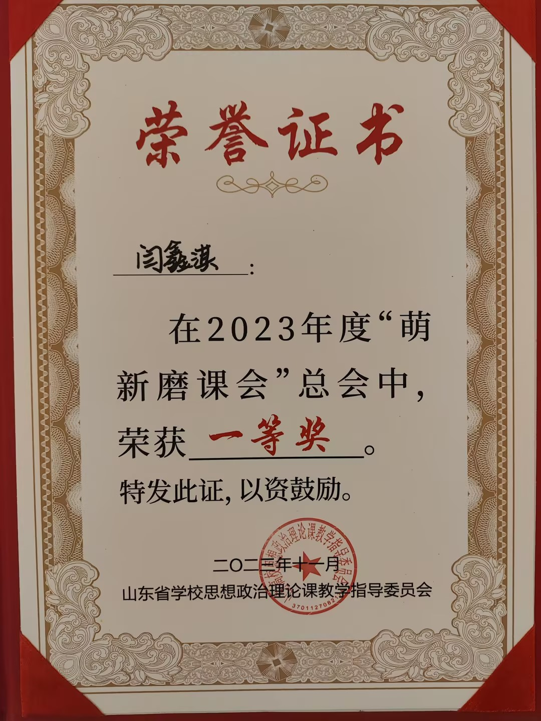 2023年11月18日,山东高校思想政治理论课教学指导委员会2023年度“萌新磨课总会”在山东省济南市举行。太阳集团网站8722思政教师闫鑫淇代表我院参加比赛,并在本科组全科目比赛中获得一等奖。山东省思政课“萌新磨课会”是由山东省教育厅指导、山东省学校思政课教学指导委员会等单位联合主办、全省入职三年以内的青年教师参加的全省大型思政教学类赛事,比赛邀请了全国和本省思政领域权威专家担任评委。本次闫鑫淇老师参赛课程为《中国近现代史纲要》,通过新颖的教学设计和别具风格的教学展示,闫鑫淇老师的授课获得了评委专家及现场观众的一致好评。