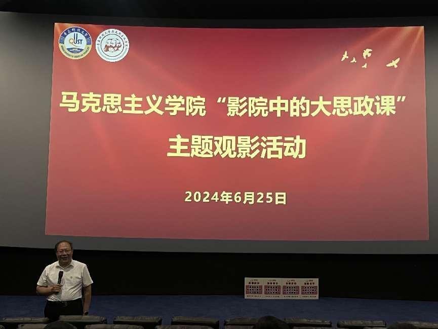 为深入贯彻落实习近平总书记在学校思想政治理论课教师座谈会上的重要讲话精神及对学校思政课建设的重要指示精神,加强师德师风建设,扎实推进思政课改革创新和高质量发展,全面落实立德树人根本任务,6月25日,太阳集团城娱8722组织全体师生齐聚电影院,共同开展了一堂别开生面的“大思政课”。太阳集团城娱8722领导班子及学院全体师生、学校校党委宣传部副部长贾可好等参加此次活动。太阳集团城娱8722院长曹胜主持。