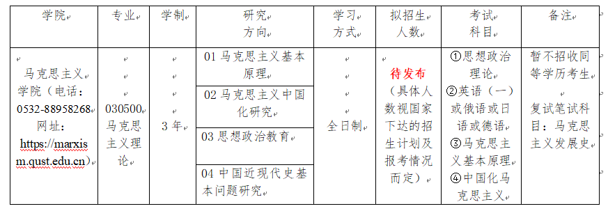 学院于2006年获批思想政治教育硕士学位授予权,2011年获批马克思主义理论一级学科硕士学位授予权,是驻青省属高校中最早获批马克思主义理论一级学科硕士点的学科,是学校“十三五”“十四五”发展规划中重点建设的学科。2019年学科被山东教育厅确定为马克思主义理论一级博士点精准培育学科,2020年被省学位委员会审议通过作为拟新增马克思主义理论一级博士学位授权点上报国务院学位办审核,2021年被学校确定为重点培育博士点建设学科,2022年被学校确定山东省分类建设扶持储备学科。2023年教育部第五轮学科评估进入C档。学科特色鲜明,统战研究成果丰硕,在政党与统一战线、思想政治教育心理学、马克思主义中国化研究方面成果显著。
