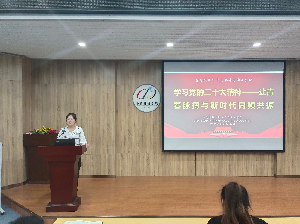 吕靓以《让青春脉搏与新时代同频共振》为题,向大家讲述了习近平总书记对广大青年的殷切期盼,结合感动中国十大人物、校园战“疫”中青科学子的青春力量,号召大家矢志不渝跟党走,扎根基层敢担当,去祖国最需要的地方,以实际行动凝聚实现中华民族伟大复兴的中国梦的强大力量。