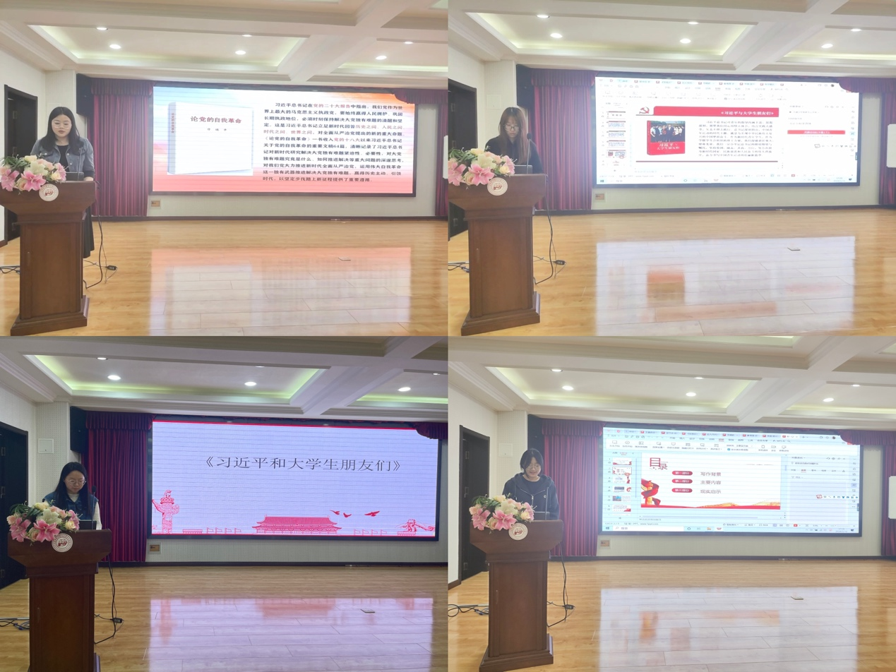 活动第一项,同学们进行经典诵读并分享学习感悟。张守信、崔高磊、孙梦瑶、张华章四位同学分享了《人民民主专政》的主要内容,这是马克思列宁主义基本原理同中国革命和建设的具体实际相结合的产物,是以毛泽东为代表的中国共产党人集体智慧的结晶。夏宗迪、张瑜、王鑫淼、李晓晴、秦雪莲、李眉、江晓晓七位同学通过分享《习近平与大学生朋友们》,阐述了习近平总书记所强调的要始终坚持理论与实践相统一的道理,呼吁同学们要坚定自己的理想和信念,与新时代同向同行、共同前进。张一诺、张雨林两位同学向大家分享了被誉为“工人阶级的圣经”的《资本论》一书,这部著作揭示了资本主义经济发展规律,展现了唯物主义的思维方法,为无产阶级斗争指引了方向。左文秀分享了《实践论》中毛泽东对马克思主义认识论进行的深刻分析和解读,这部著作从辩证的角度看待认识与实践的关系,真正实现了唯物论与辩证法的有机统一。单小双通过分享《论党的自我革命》阐述了党的自我革命的内涵、特点以及党的自我革命的重要性。