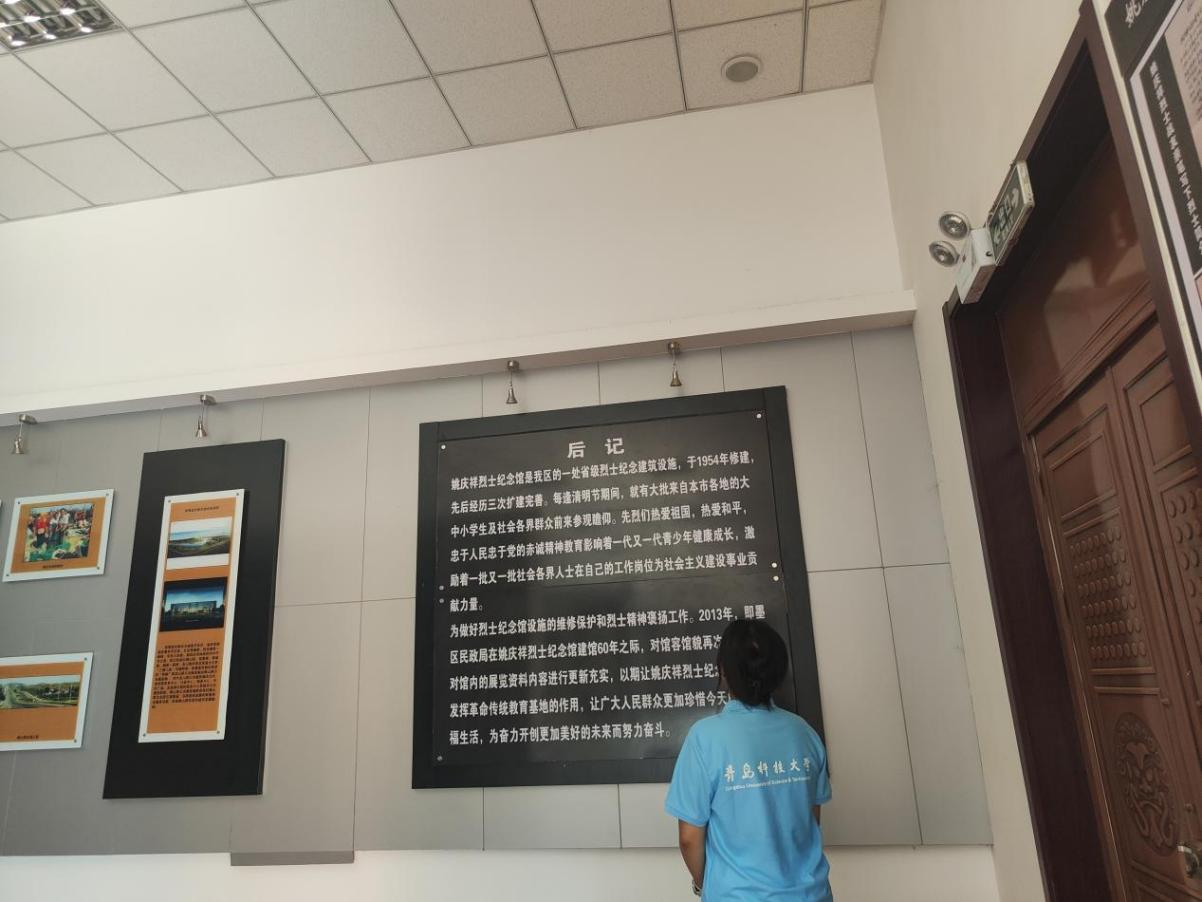 团队成员曲文文走进青岛市即墨区鳌山卫镇姚家庄村的姚庆祥烈士纪念馆。该馆堂内陈列着图片、照片和文字资料,院内有纪念亭、纪念碑并镌有碑文,介绍了“和平战士”姚庆祥的生平事迹,展示了为“抗美援朝,保家卫国”抛头颅、洒热血的革命英雄精神。