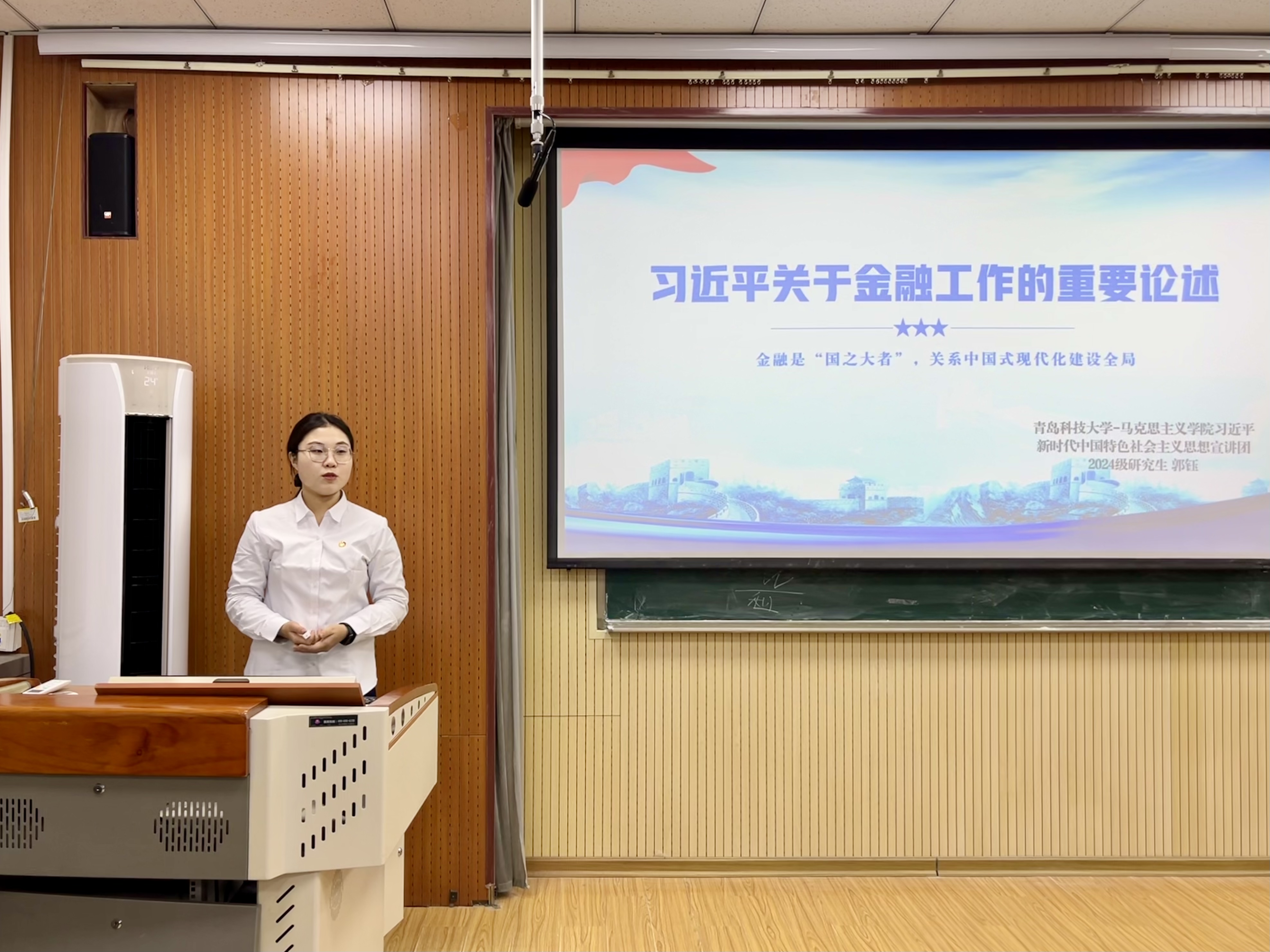 郭钰以《习近平关于金融工作的重要论述》为主题,详细介绍了习近平总书记关于金融工作的重要论述,重点强调了推进金融高质量发展、加快建设金融强国的目标等核心要点。她通过鲜活生动的案例,进一步加深了经管学子对金融工作的理解与认识,激励大家不断提升专业素养,为实现金融强国目标贡献青春力量。