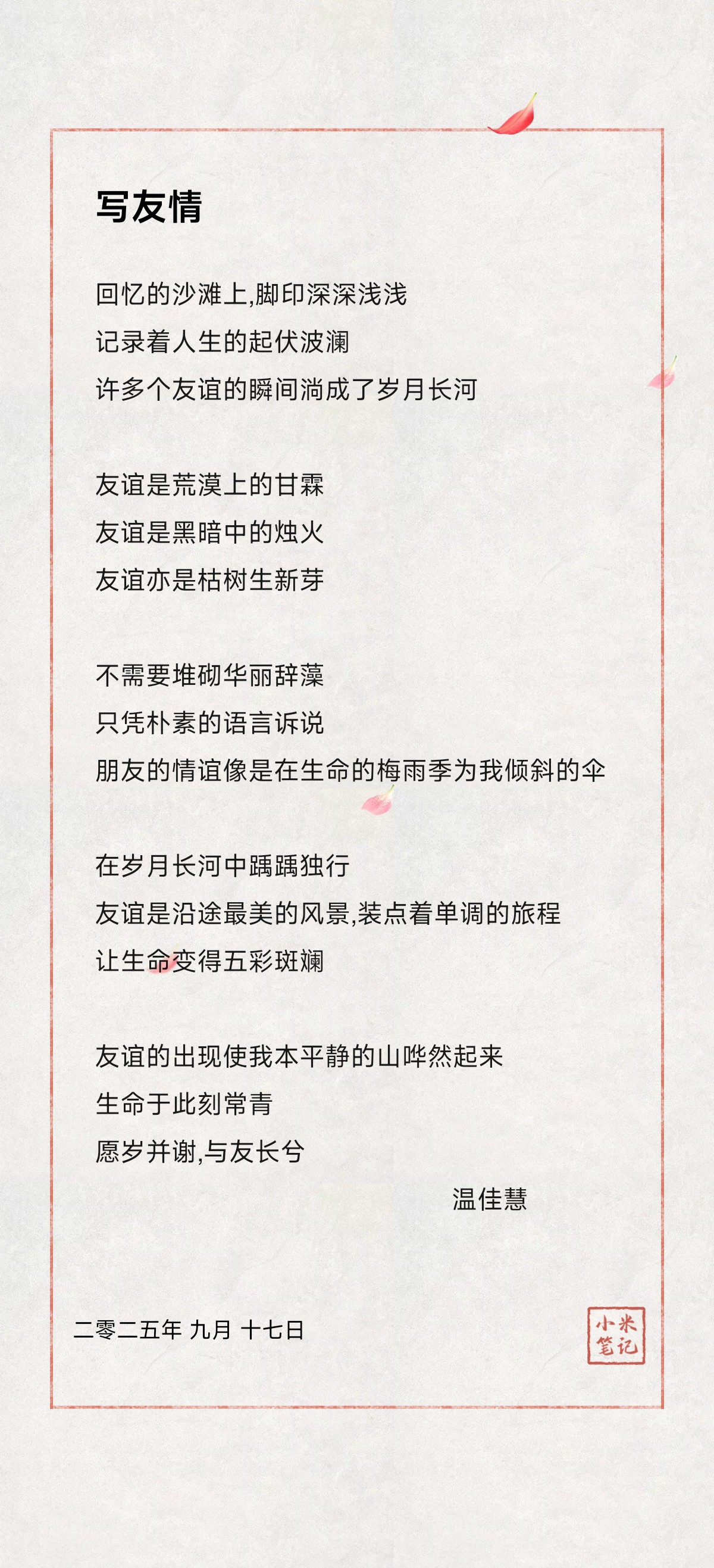 活动期间,太阳集团城娱8722通过线上方式向同学们征集与友情相关的诗歌、信件及影像资料。同学们踊跃参与,字里行间藏着同窗间的暖心瞬间,镜头内外定格着相伴的珍贵画面,这些充满温度的作品不仅让友情有了具象的表达,更让“友爱” 的种子在校园里愈发蓬勃生长。