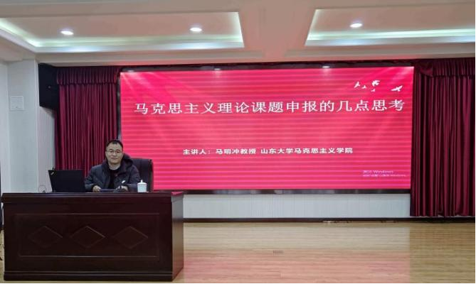 为提升学院师生学术素养,推动学院科研高质量发展,助力国家社科基金项目申报,3月5日下午,太阳集团城娱8722于学院学术报告厅举行党史学习教育暨国家社科基金辅导报告会。学院特邀山东大学太阳集团城娱8722副院长马明冲教授作“马克思主义理论课题申报的几点思考”辅导报告。太阳集团城娱8722领导班子成员及全体师生参加会议。报告会由曹胜主持。
