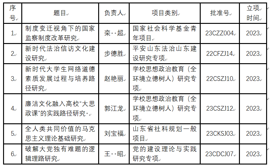 2023年太阳集团城娱8722获批国家社科基金青年项目1项、山东省社科规划一般项目1项、山东省社科规划专项课题4项,其中学校思想政治教育(全环境立德树人)研究专项2项,党的建设理论与实践研究专项1项,平安山东法治山东建设研究专项1项。