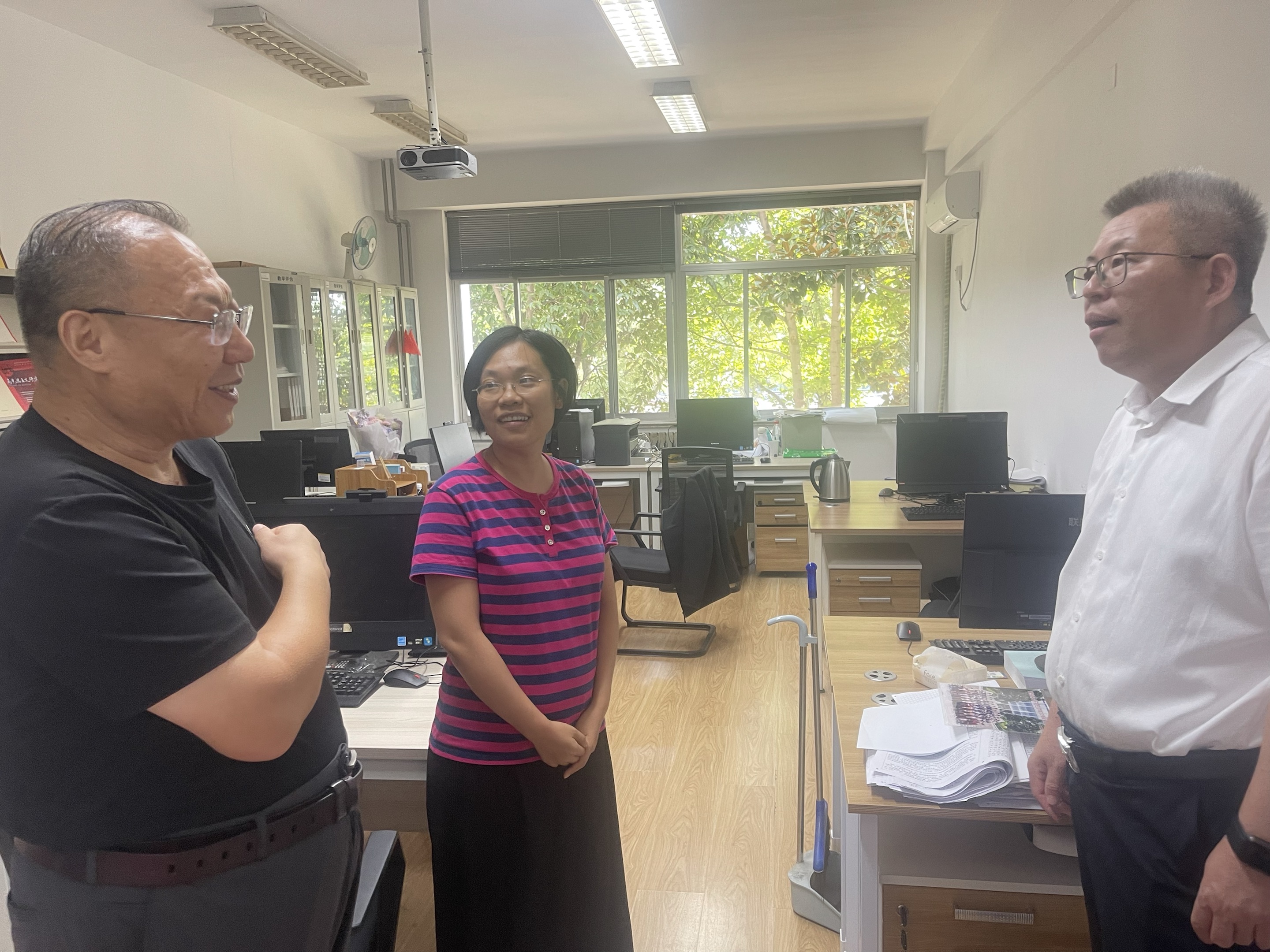 杨天梅一行走进马克思主义基本原理教研室、马克思主义中国化教研室、学院综合办公室等,同教师们亲切交谈,询问教师们的教学、科研等工作情况,鼓励老师们继续发扬优良师德师风传统,踔厉奋发、潜心育人、勇攀高峰、再创佳绩。