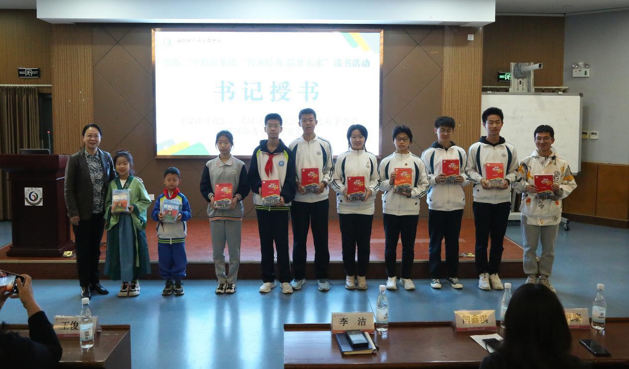 会上,青岛二中学生代表许皓清、青岛二中政治发研室代表高保卫、青岛二中历史发研室主任靳庆然、青岛二中党委书记李洁分别以《读书之乐乐在无穷》《和一本书相遇》《阅读与立德树人》《书记荐读》为主题进行分享。会议最后,青岛二中党委书记李洁给学生代表授书。