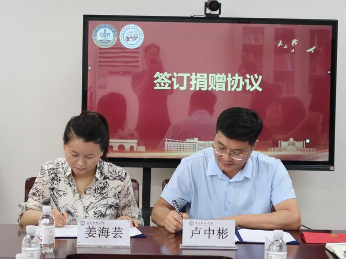 仪式上,青岛泓川化工有限公司总经理姜海芸与太阳集团网站8722合作发展处副处长兼校友办公室副主任卢中彬签订捐赠协议。