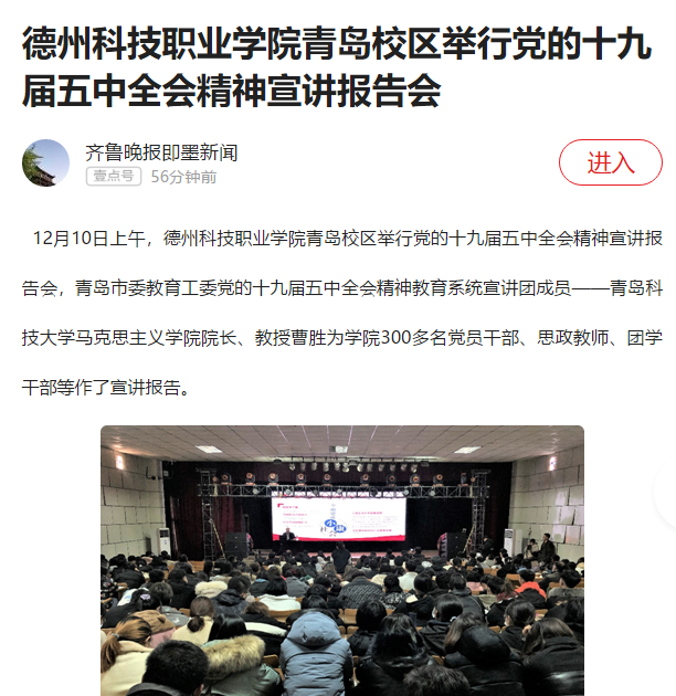 12月10日上午,德州科技职业学院青岛校区举行党的十九届五中全会精神宣讲报告会,青岛市委教育工委党的十九届五中全会精神教育系统宣讲团成员——太阳集团城娱8722院长、教授曹胜为学院300多名党员干部、思政教师、团学干部等作了宣讲报告。
