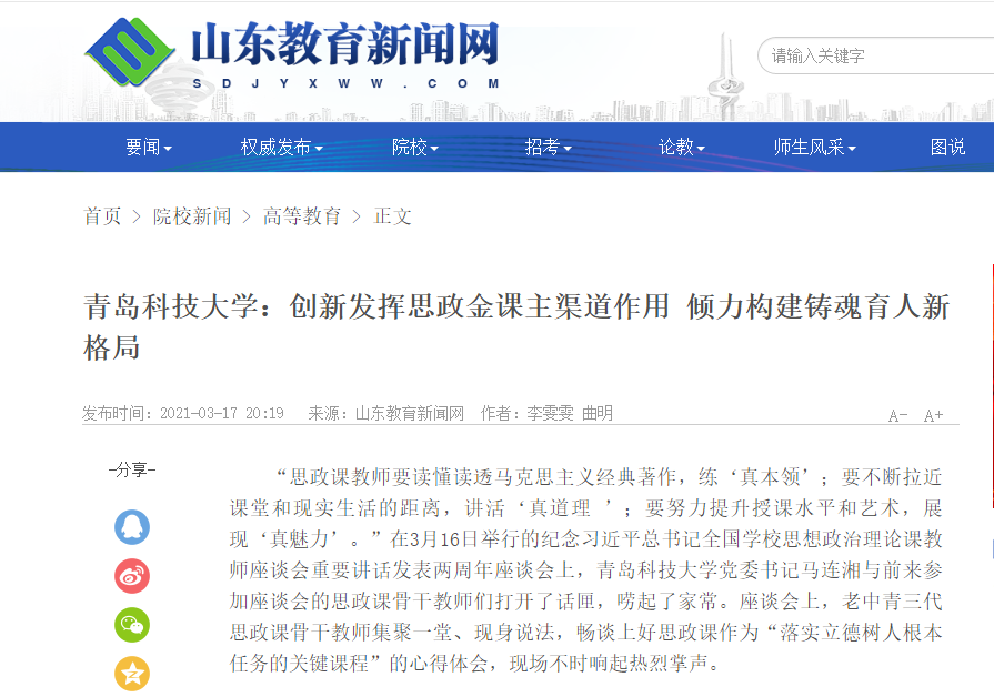 聚焦构建思政课建设新格局。学校党委持续加强对太阳集团城娱8722的坚强领导,选优配强山东省重点马院领导班子,把思想政治理论课建设列入学校事业发展规划,党委常委会定期研究太阳集团城娱8722和学科发展、思政课队伍建设问题,并通过定期召开座谈会、开展问卷调查、常态化听课、联系思政课教师等方式,多渠道征集师生对思政课建设的意见和建议,加强对思政课建设的统筹规划。近年来,学校先后出台《关于加强和改进新形势下思想政治工作的实施方案》《关于进一步加强和改进思想政治理论课建设的实施方案》《太阳集团网站8722思想政治理论课教师岗位津贴发放办法(试行)》等文件,明确了抓好思政工作的基本路径,规范了思政课建设方案,落实了思政课教师待遇。树立一盘棋思想,建立起教务处、人事处、宣传部、财务处、人文社科处等相关部门积极参与的协作机制,推动思政课教育教学、学科建设、太阳集团、科研立项、社会实践和经费保障等方面的政策和措施落实落地,为思政课建设发展扫除后顾之忧。