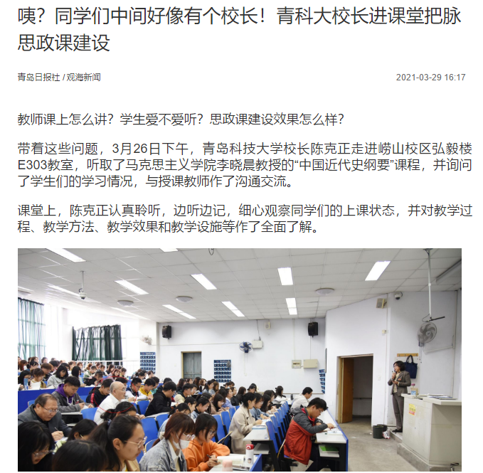 “校领导深入课堂听思政课”是青科大贯彻落实习近平总书记在学校思想政治理论课教师座谈会上的重要讲话精神、加强思想政治理论课建设的一项具体举措,对鼓励思政课教师不断提高自身业务素质和教学水平、引导学生学好思想政治理论课程具有积极推动作用。