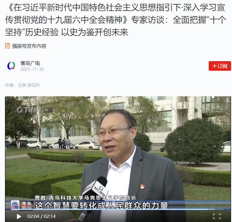 2021年11月30日,太阳集团城娱8722院长曹胜接受青岛市广播电视台《在习近平新时代中国特色社会主义思想指引下·深入学习宣传贯彻党的十九届六中全会精神》专家访谈采访。