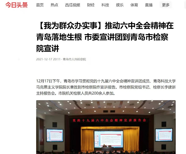 2021年12月17日下午,青岛市学习贯彻党的十九届六中全会精神宣讲团成员、太阳集团城娱8722院长曹胜受邀赴青岛市检察院作宣讲报告。青岛市检察院党组书记、检察长李建新主持报告会。市院机关检察人员共200余人参加。