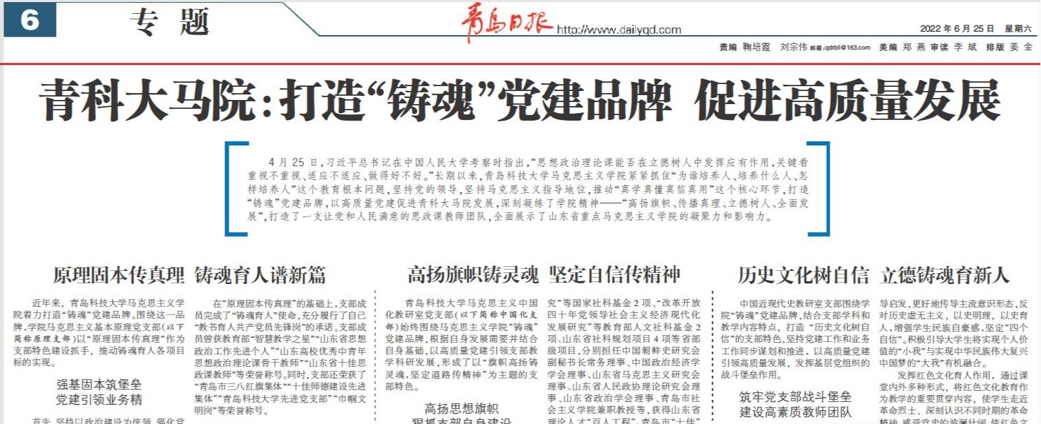 4月25日,习近平总书记在中国人民大学考察时指出,“思想政治理论课能否在立德树人中发挥应有作用,关键看重视不重视、适应不适应、做得好不好。”长期以来,太阳集团城娱8722紧紧抓住“为谁培养人、培养什么人、怎样培养人”这个教育根本问题,坚持党的领导,坚持马克思主义指导地位,推动“真学真懂真信真用”这个核心环节,打造“铸魂”党建品牌,以高质量党建促进青科大马院发展,深刻凝练了学院精神——“高扬旗帜、传播真理、立德树人、全面发展”,打造了一支让党和人民满意的思政课教师团队,全面展示了山东省重点太阳集团城娱8722的凝聚力和影响力。