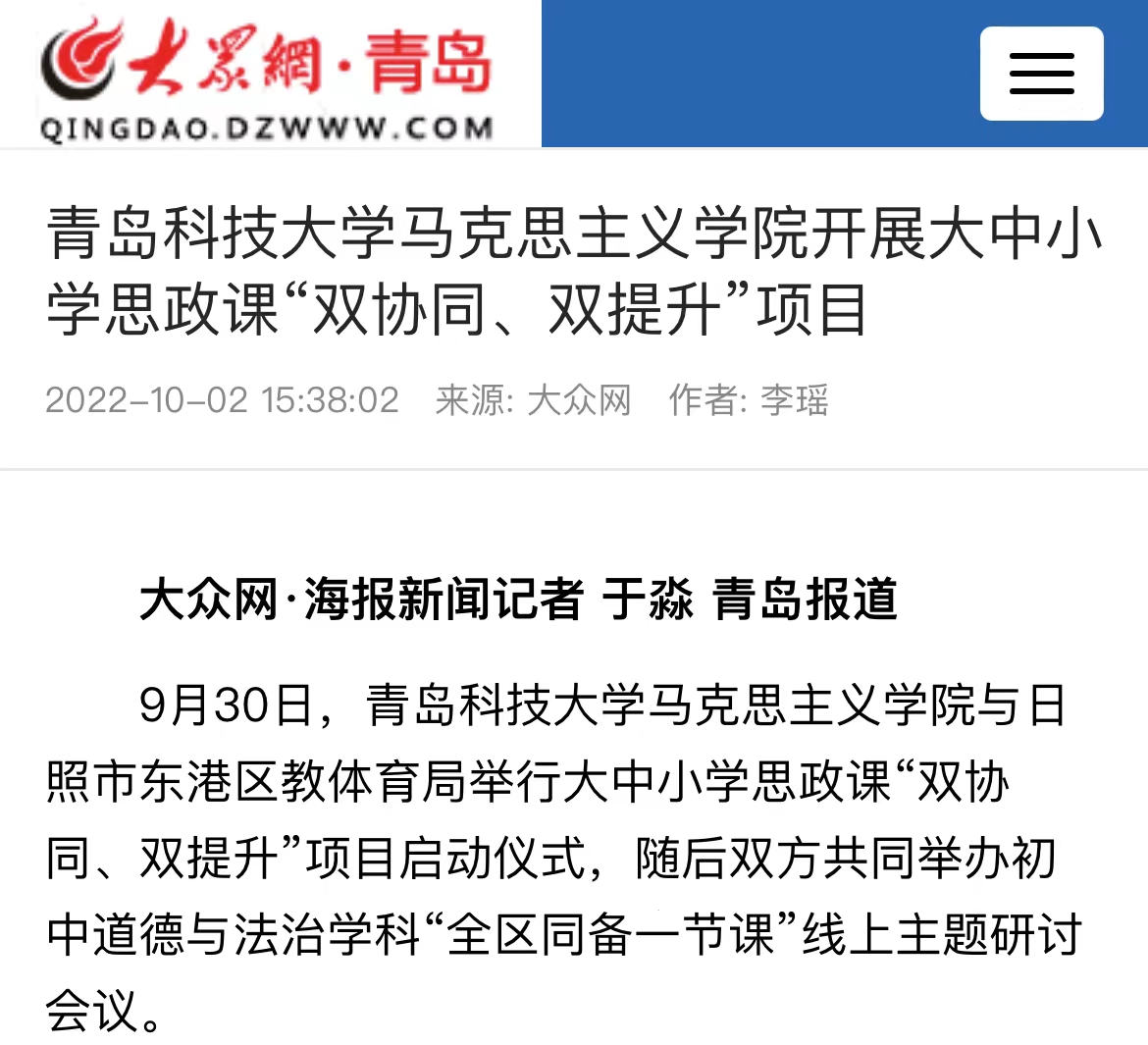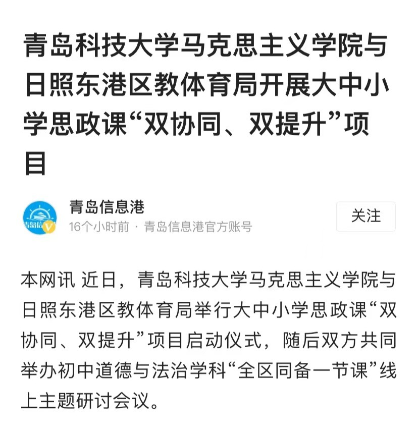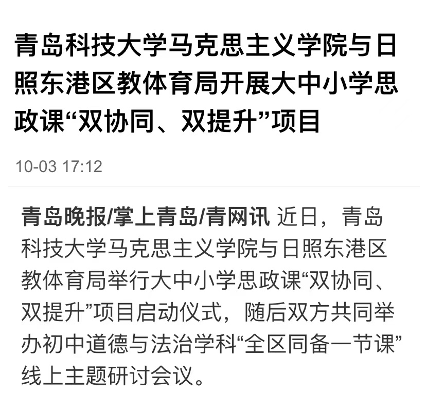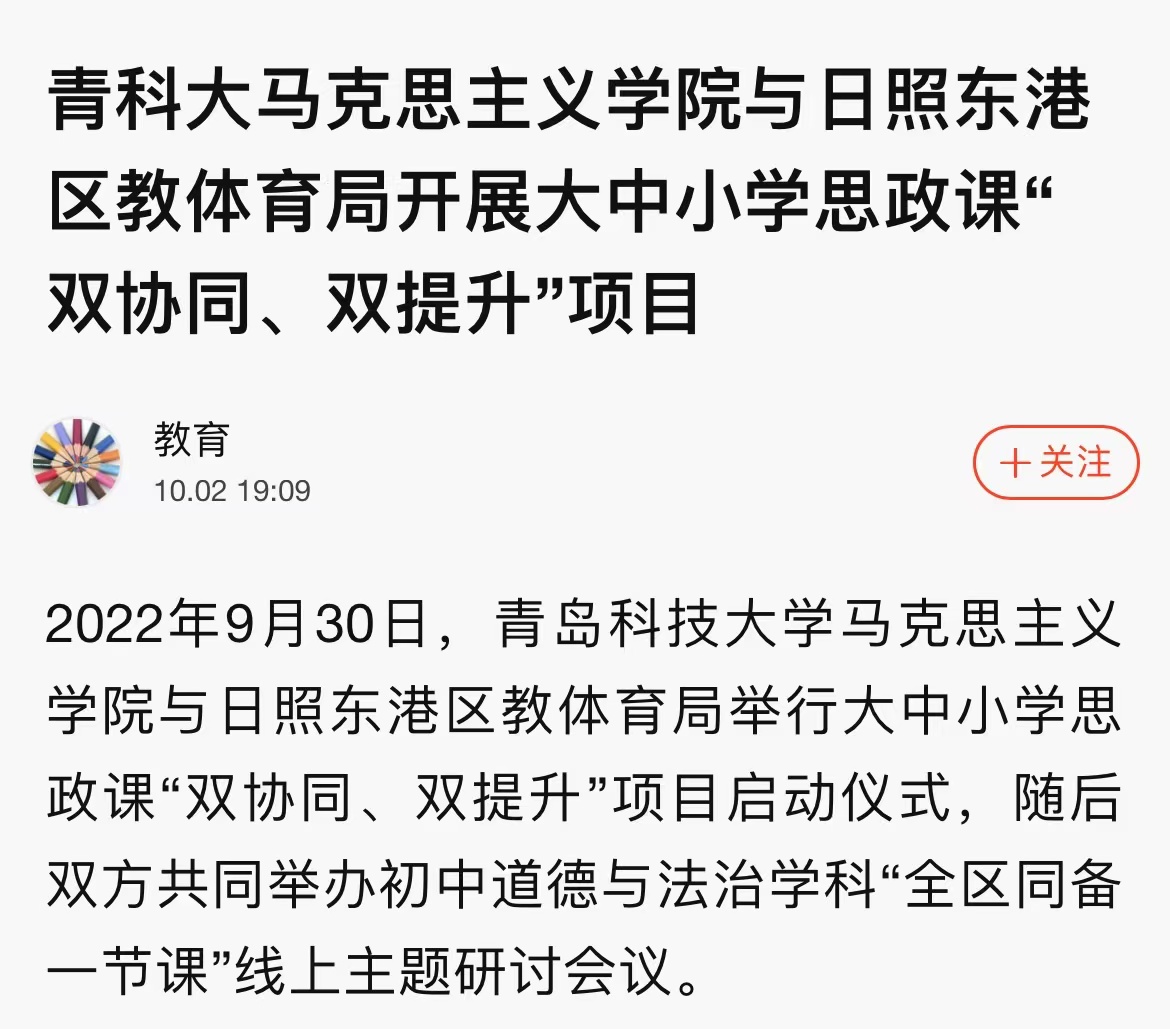 9月30日,太阳集团城娱8722与日照东港区教体育局大中小学思政课“双协同、双提升”项目正式启动。据悉,双方将在教学、科研、队伍建设等方面的合作将全面展开。