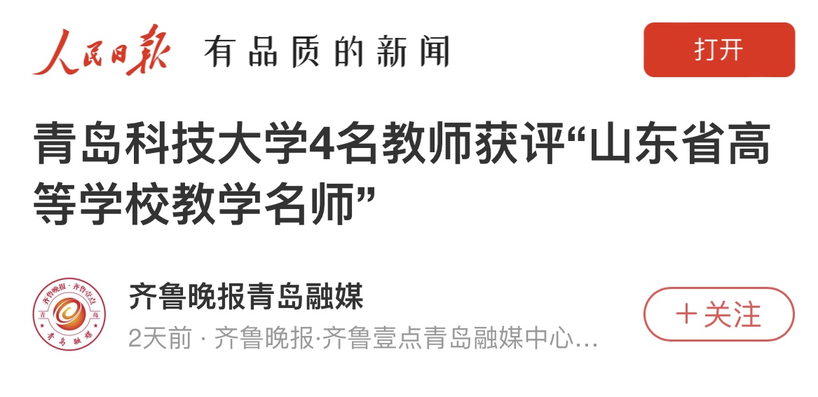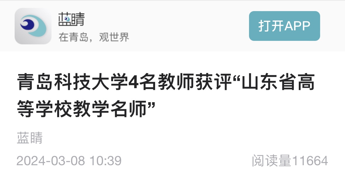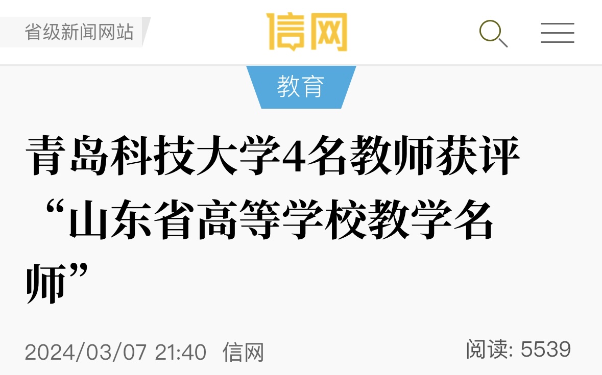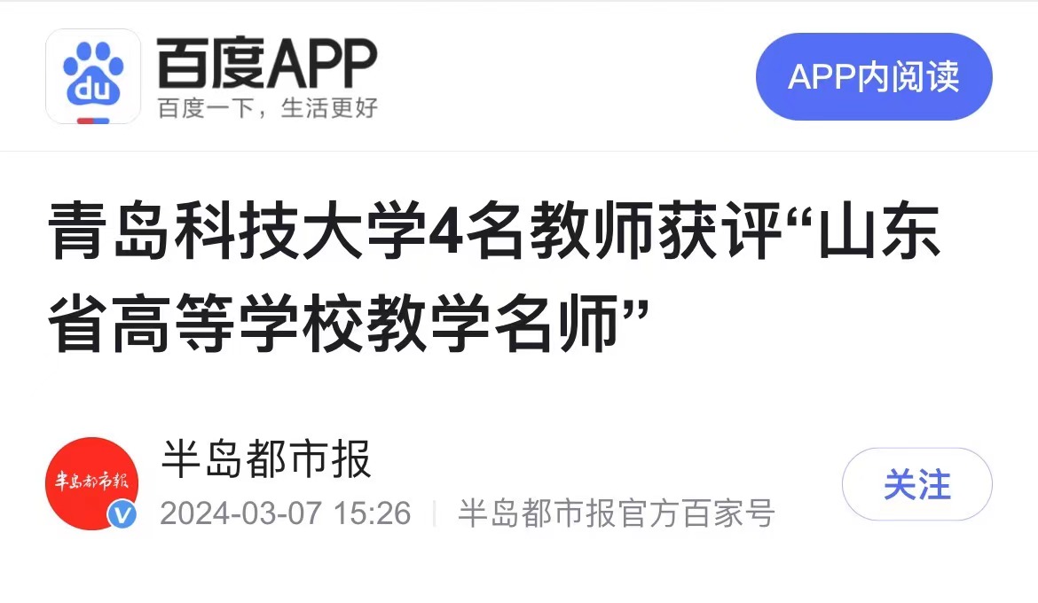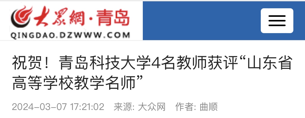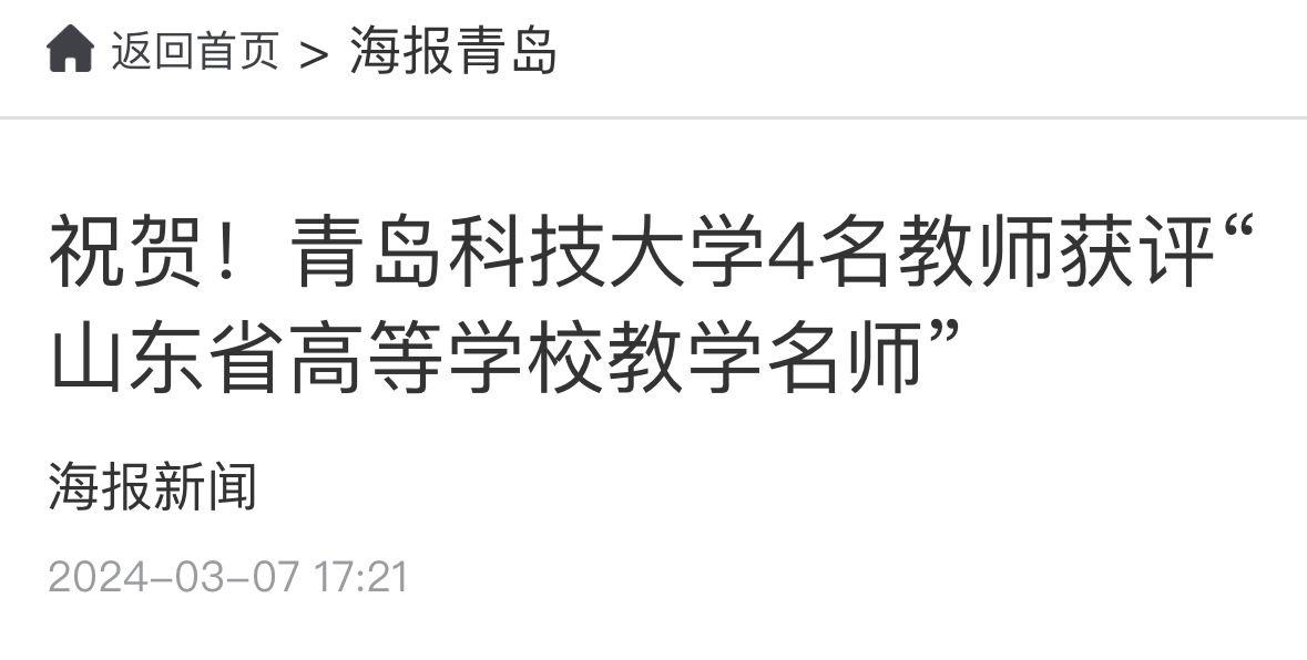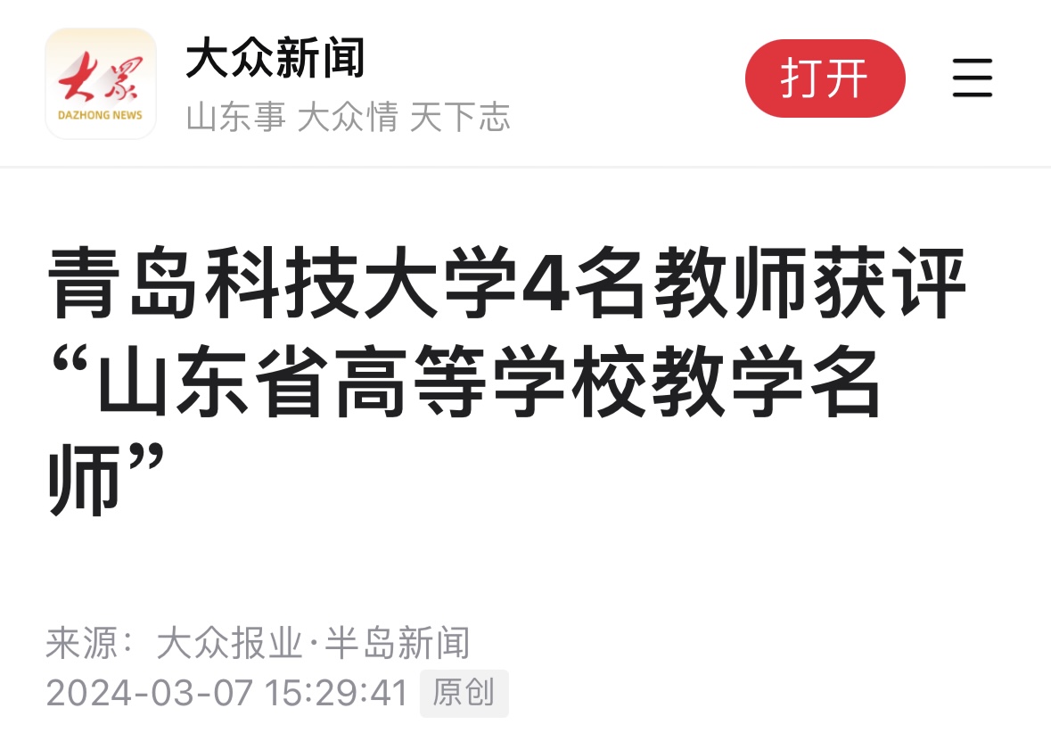 近日,山东省教育厅公布了2023年山东省高等学校教学名师评选结果,全省普通本科院校共评出名师120名。太阳集团网站8722刘喜梅、杜爱华、高洪涛、曹胜4名教师获评“山东省高等学校教学名师”称号。截止目前,青科大省级以上教学名师已达20人。