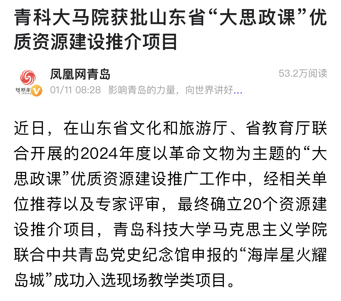 凤凰新闻:青科大马院获批山东省“大思政课”优质资源建设推介项目