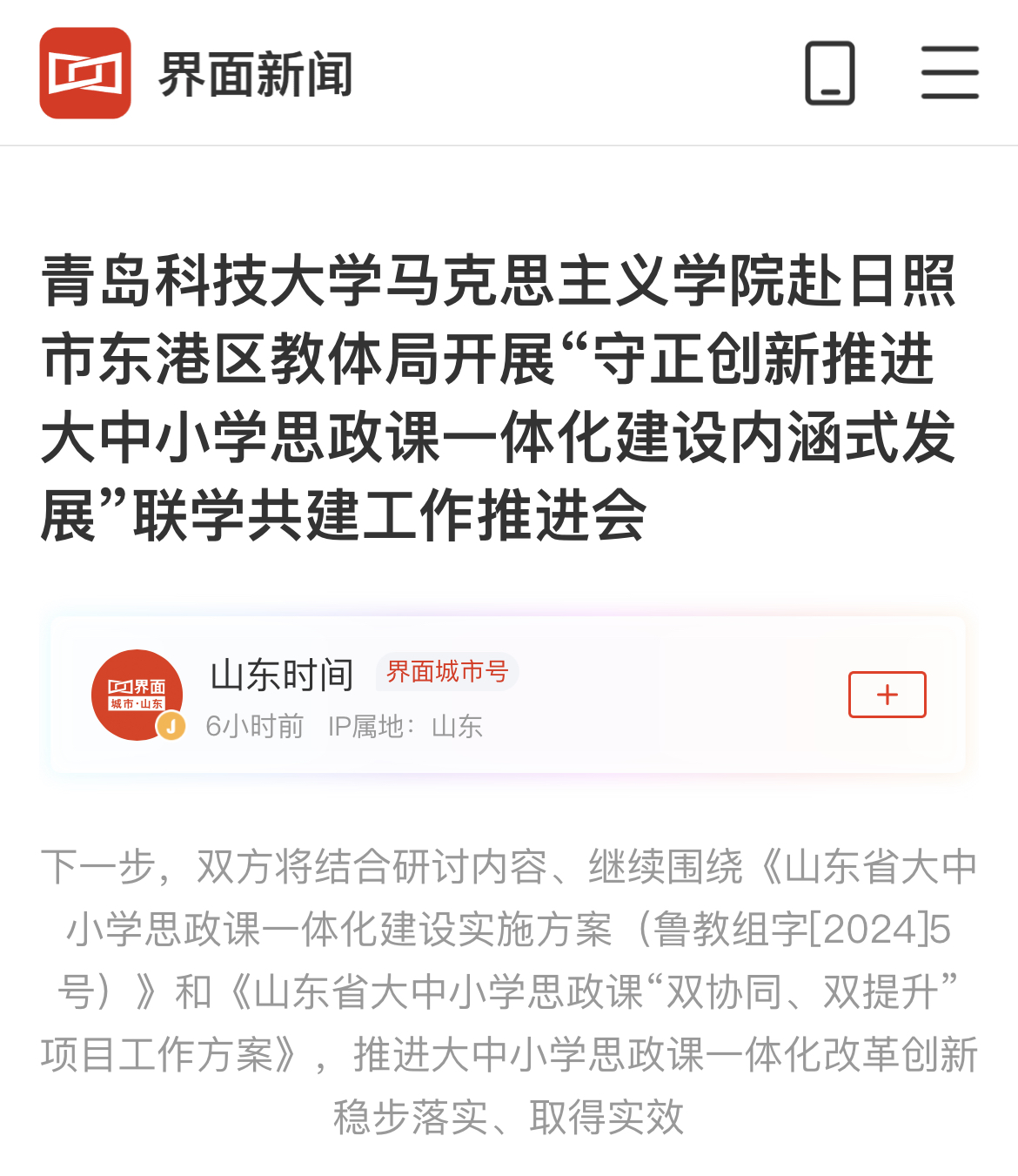 界面新闻:青科大马院与日照市东港区教体局开展“守正创新推进大中小学思政课一体化建设内涵式发展”联学共建工作推进会