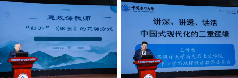 随后,北京师范大学李晓东教授以《思政课教师“打开”〈纲要〉的正确方式》、中国海洋大学王付欣教授以《讲深、讲透、讲活中国式现代化的三重逻辑》为题作报告,为思政教师提供了理论支撑与教学方法论指导。