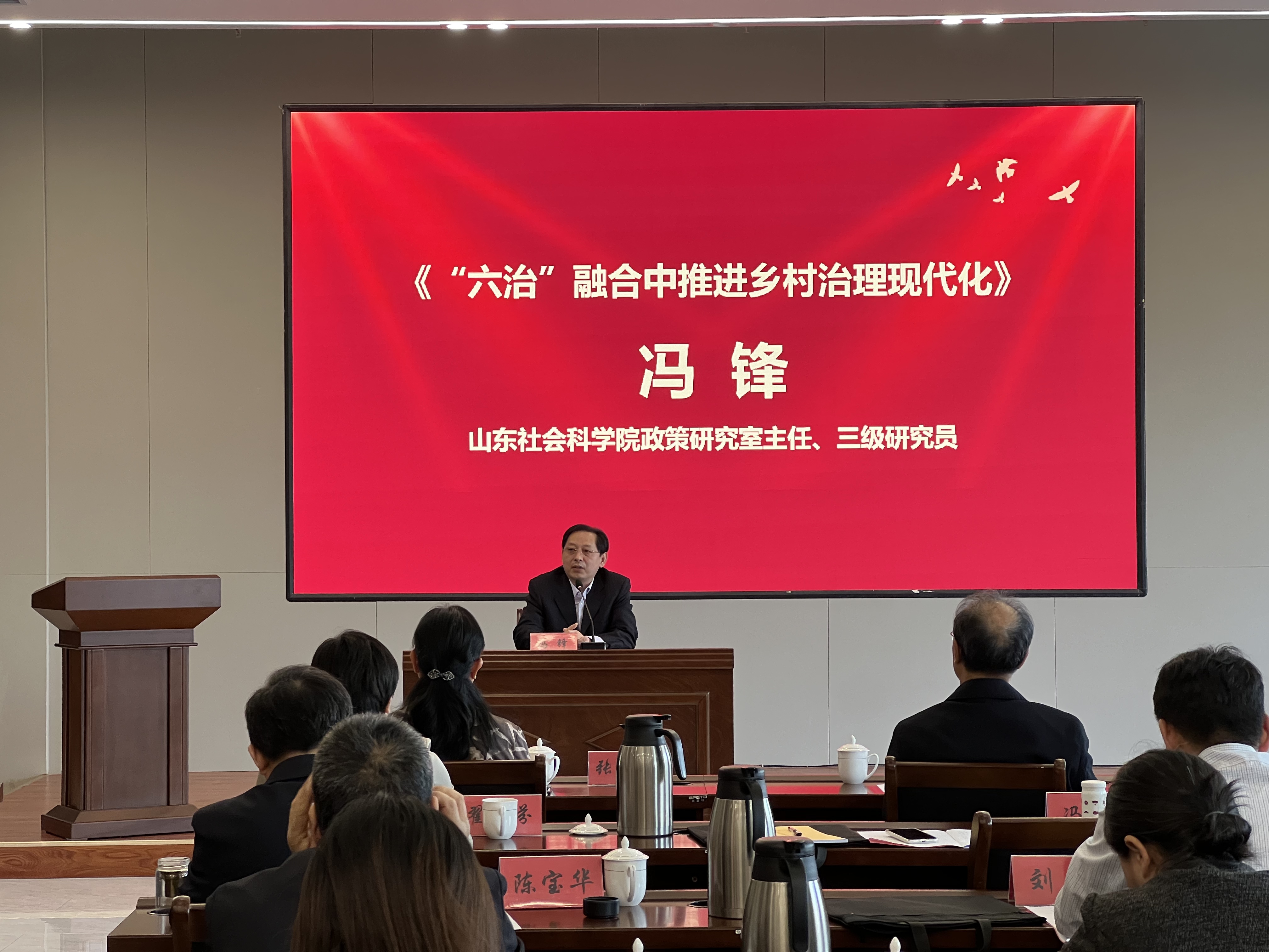 山东社会科学院政策研究室主任、三级研究员冯锋以《“六治”融合中推进乡村治理现代化》作主题报告。
