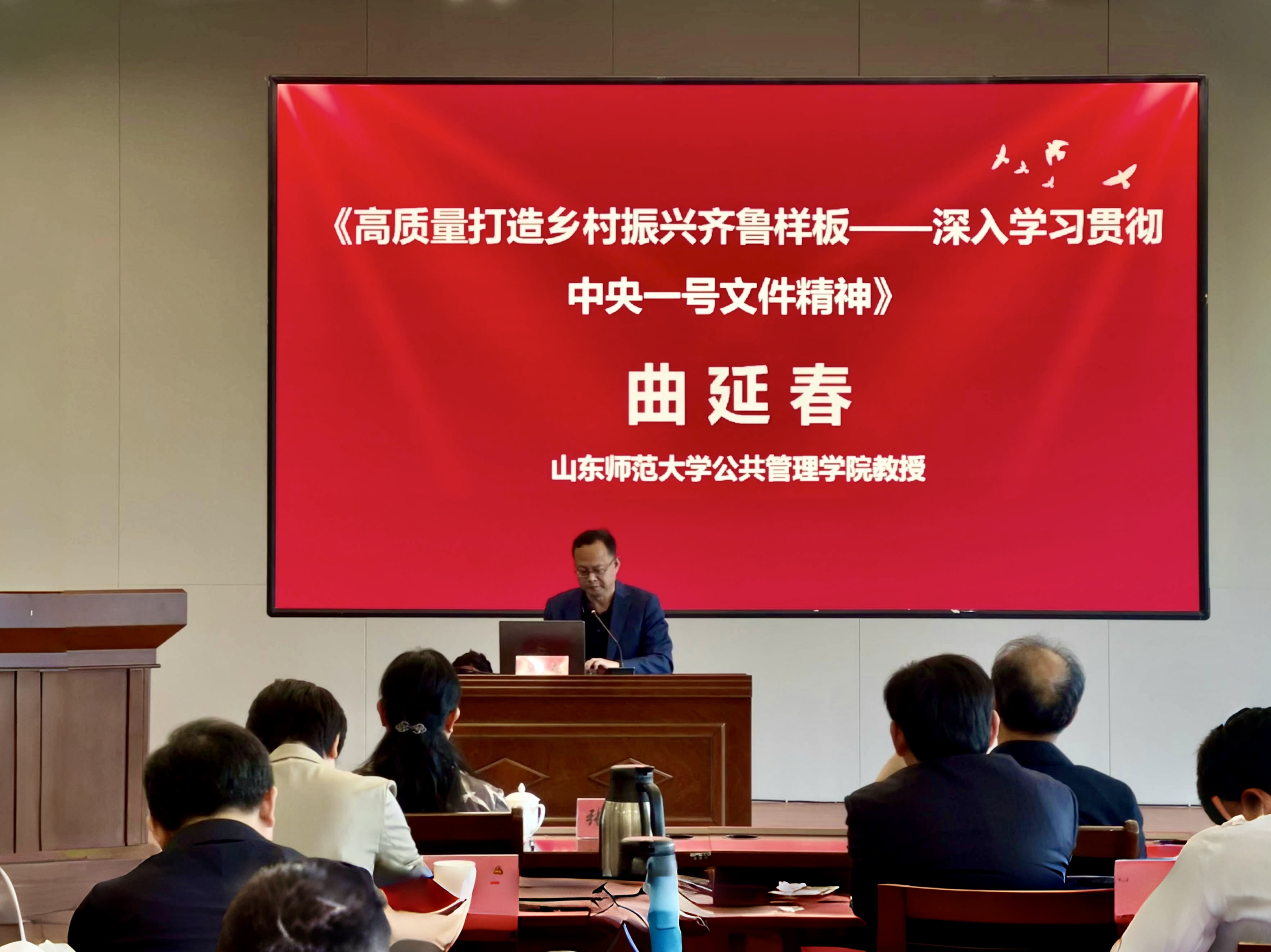 山东师范大学公共管理学院曲延春教授围绕《高质量打造乡村振兴齐鲁样板——深入学习贯彻中央一号文件精神》作主题报告。
