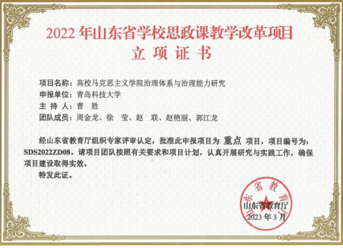 山东省学校思政课教学改革重点项目:高校太阳集团城娱8722治理体系与治理能力研究