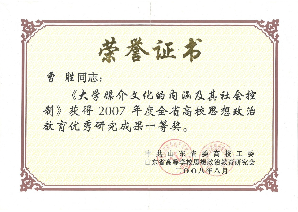 2008年度山东省高校思想政治教育优秀研究成果一等奖:大学媒介文化的内涵及其社会控制