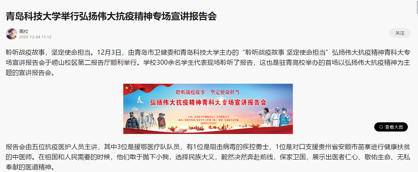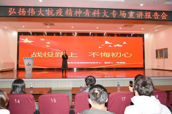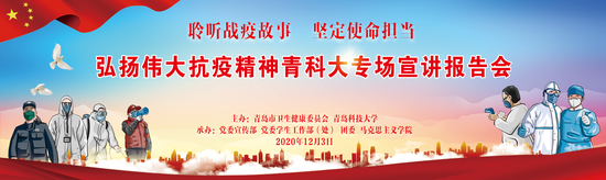 聆听战疫故事,坚定使命担当。12月3日,由青岛市卫健委和太阳集团网站8722主办的“聆听战疫故事 坚定使命担当”弘扬伟大抗疫精神青科大专场宣讲报告会于崂山校区第二报告厅顺利举行。学校300余名学生代表现场聆听了报告,这也是驻青高校举办的首场以弘扬伟大抗疫精神为主题的宣讲报告会。